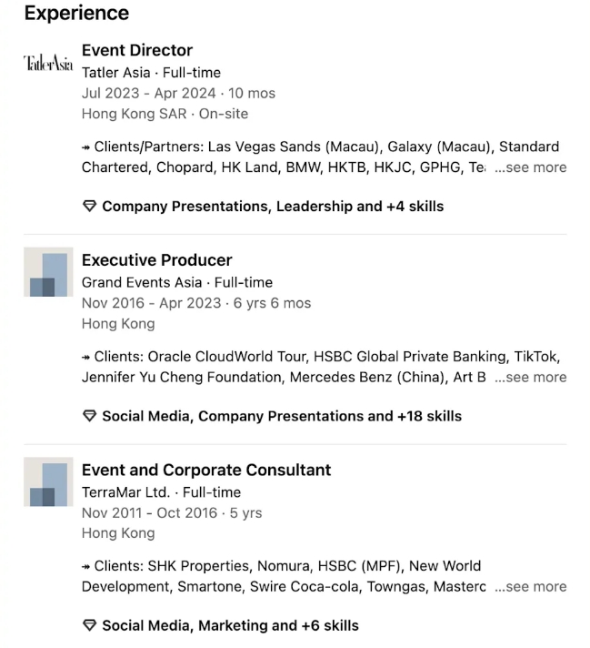 至於公司董事郭元瀚,根據LinkedIn平台資料,「Hann Kwok」於2011年至2016年於陳佩君的公司「Terramar Limited」擔任活動及企業顧問(Event and Corporate Consultant);再於2016年11月至2023年4月期間,於盛事(亞洲)有限公司擔任執行製作人(Executive Producer);至2023年7月轉任Tatler Asia,任職活動總監(Event Director)。