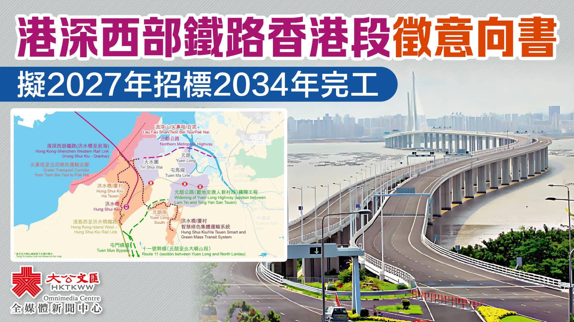 政府計劃透過公開招標推展港深西部鐵路(洪水橋至前海)香港段。發言人表示,路政署早前於7月25日、8月1日及7日分別在深圳、廣州及香港舉行了簡介會,介紹港深西部鐵路(洪水橋至前海)香港段及邀請業界提交意向書的事宜。共有超過160個業界團體參加了上述的三場簡介會,並於會上提出了不少寶貴的觀點和建議。政府現正式邀請業界就港深西部鐵路(洪水橋至前海)香港段提交意向書,就項目方案、採購安排、財務安排、推展時間表等各方面提供進一步的意見。從意向書所收集的意見將有助政府更好掌握市場對建造及營運項目的想法,制定更合適的招標細節和條款。