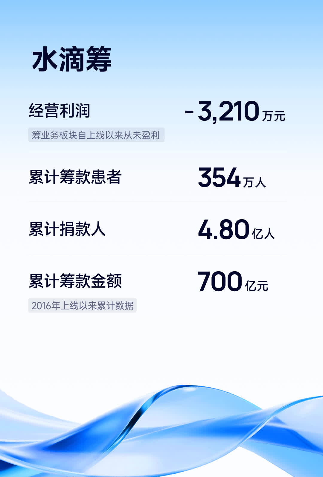 本季度,水滴籌業務繼續發揮「救急難」作用。截至2025年6月30日,水滴籌上線以來累計約4.8億用戶向354萬名患者捐贈700億元。