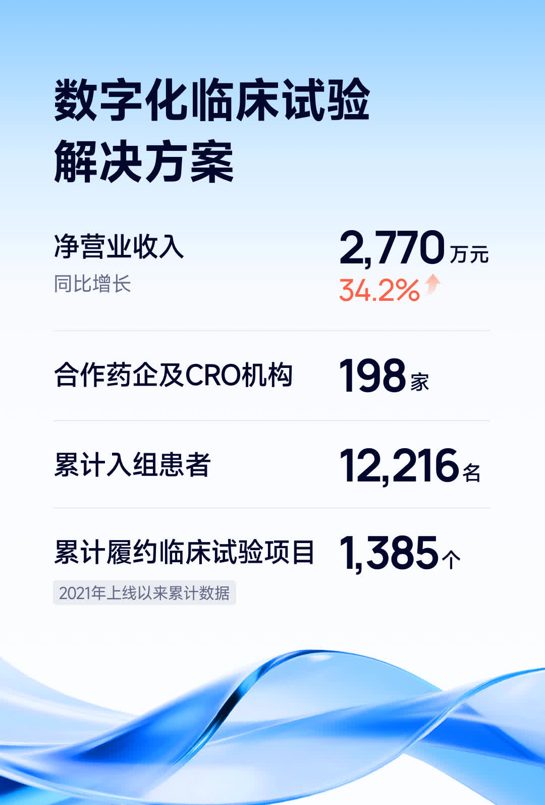 水滴公司數字化臨床試驗業務取得良好進展,進入規模擴張與效率優化並行的關鍵階段。2025年第二季度淨營業收入2770萬元,同比增長34.2%。截至6月底,翼帆醫藥已與198家海內外知名藥企及CRO機構建立合作關係,累計履約項目1385個,累計入組患者12216名。本季度,翼帆醫藥新簽訂的臨床試驗項目數量達到114個,成功完成患者入組人數約為999名,創造單季度歷史入組人數新高,運營效率顯著提升。