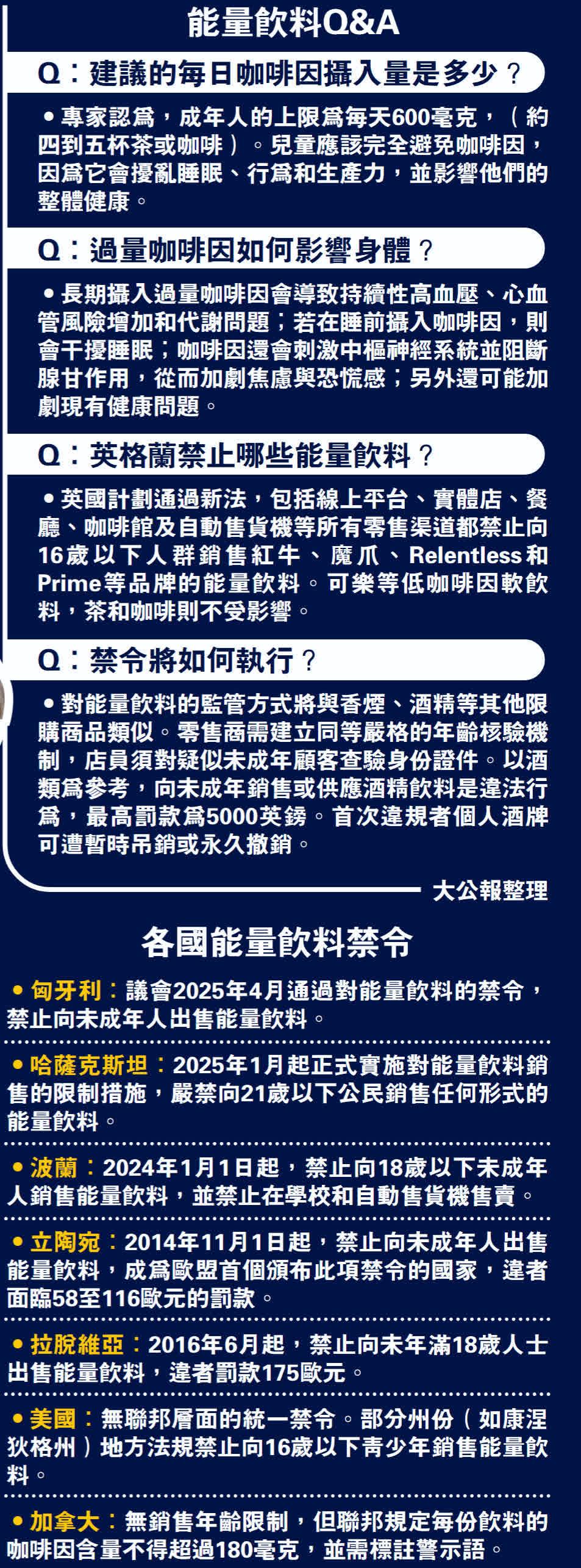 大公報綜合報道,英國政府近日宣布,計劃在英格蘭地區立法,禁止商家向任何未滿16歲人士出售紅牛(Red Bull)、魔爪(Monster)和Prime等高咖啡因能量飲料,該法律適用於商店、餐廳、咖啡館、自動販賣機及網上購物等零售渠道。當局已就立法啟動為期12周的公眾諮詢,外界普遍預期該法將順利通過。英國政府稱,該禁令有望幫助多達4萬名英國兒童預防肥胖疾病,並緩解睡眠、情緒、專注力等問題,同時改善學業表現。