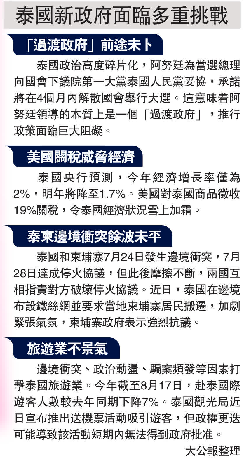 大公報綜合報道,泰國自豪泰黨黨首阿努廷5日在國會下議院特別會議投票中以壓倒性的優勢勝出,將成為泰國第32任總理。為獲得足夠票數,阿努廷答應國會第一大黨人民黨苛刻條件,包括4個月內解散國會下議院、為重新選舉鋪路,意味着他領導的本質上是一個「過渡政府」,推行政策將面臨阻礙。有分析指出,阿努廷面臨嚴峻考驗,4個月後能否繼續擔任總理存在不確定性。