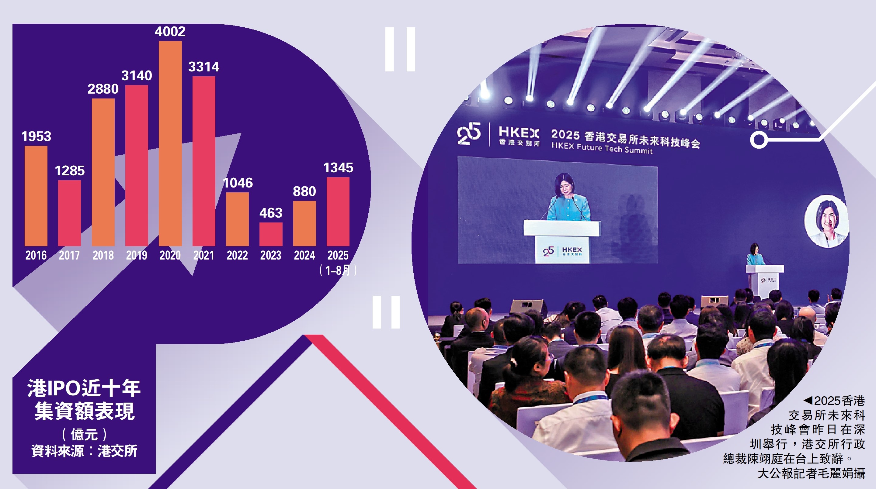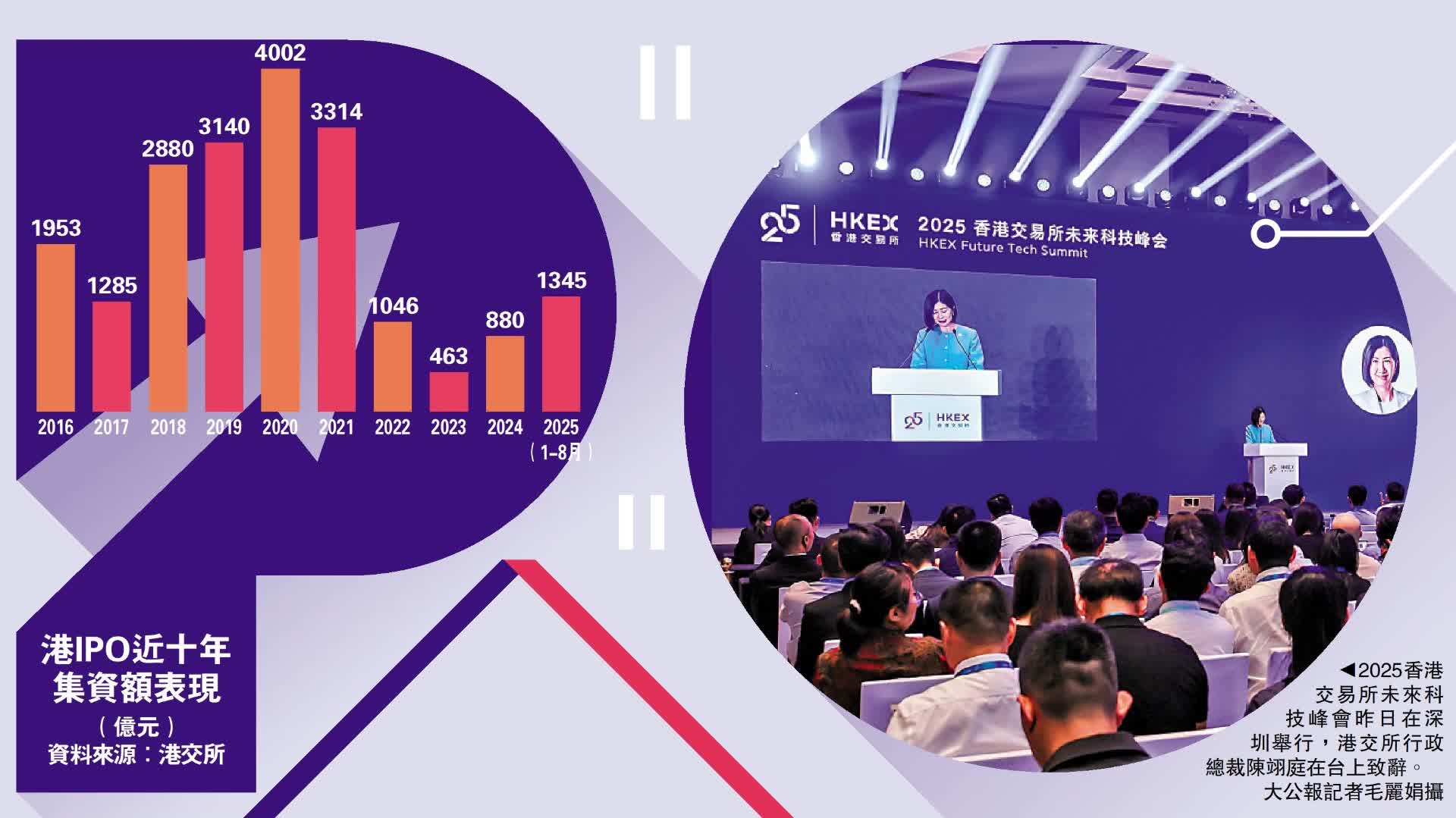 2025香港交易所未來科技峰會昨日在深圳舉行。陳翊庭致辭時表示,目前上市科正在處理的上市申請超過200家企業,其中接近一半來自科技企業。截至8月底,新股首發融資總額達1345億港元,同比增長近6倍,超全球新股融資額的同比增幅。其中,「A+H」上市模式佔上半年總融資額的七成,內地與香港資本市場聯動的勢頭強勁。再融資活動同樣活躍,截至8月底,再融資總額為同期新股融資額的兩倍以上,科技企業再融資佔比接近四成。
