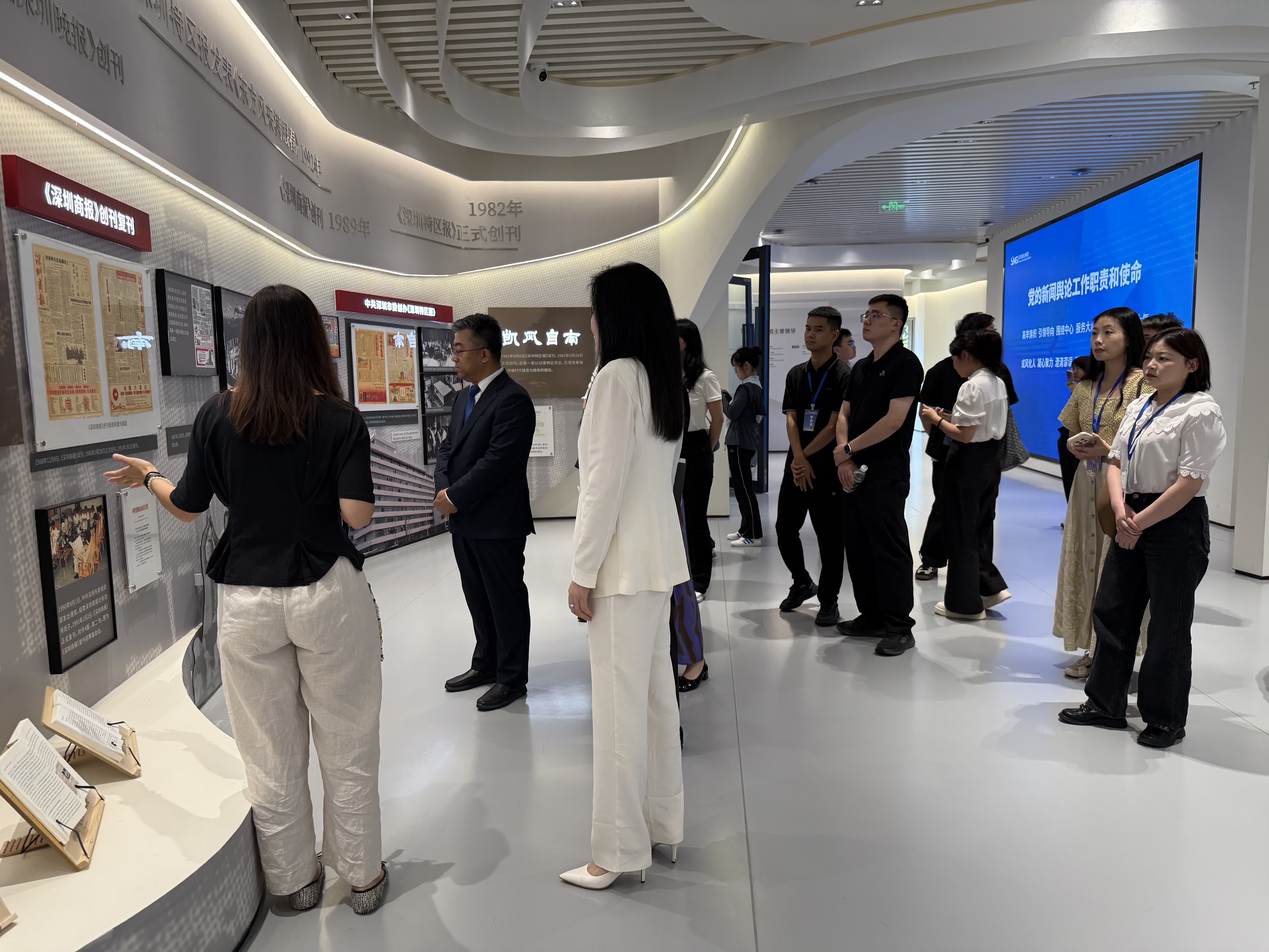 參訪過程中,學員們系統了解了從《深圳特區報》正式創刊到集團化改革,直至如今建成覆蓋「紙媒+網站+客戶端+官微+政務新媒體運營+傳媒智庫」的全媒體矩陣的發展歷程,深切感受到傳統媒體與時代同頻共振的轉型之路。在演播室、全媒體指揮中心及辦公區,學員們實地考察了新聞視頻錄製流程,觀看了由AI技術生成的多媒體作品,並深入了解了現代化媒體機構高度專業化、垂直化的分工運作模式。