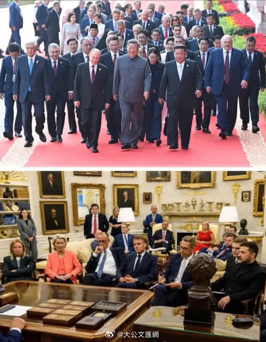 對比圖的下半部分,拍攝於當地時間8月18日,歐洲多國領導人受邀前往華盛頓,同澤連斯基、特朗普舉行會晤。這次會晤,澤連斯基和歐洲領導人均放低姿態,將對特朗普說「謝謝」當作一項重要任務,試圖阻止他在烏克蘭問題上倒向俄羅斯,但美國與烏歐在停火、安全保障和領土三大核心議題上的分歧依然存在。