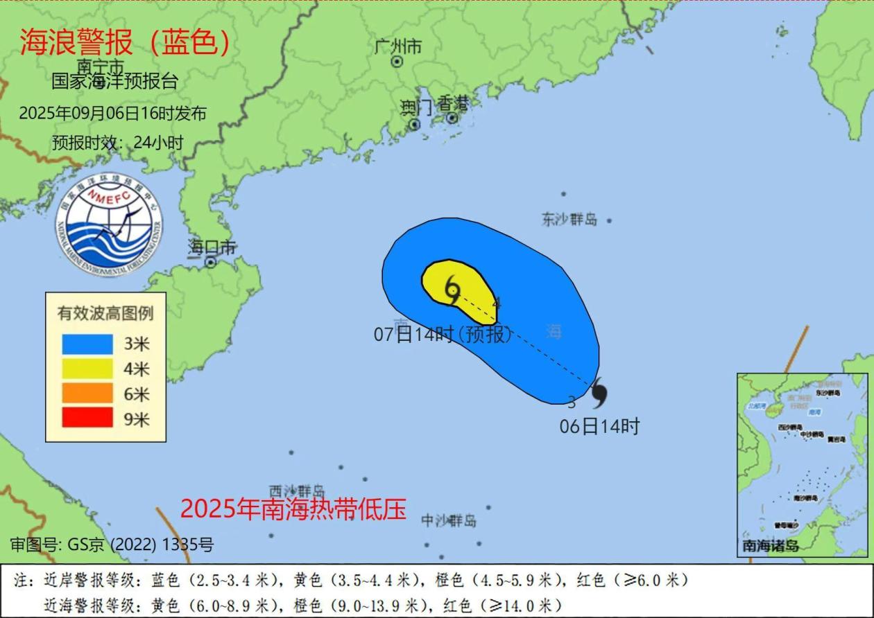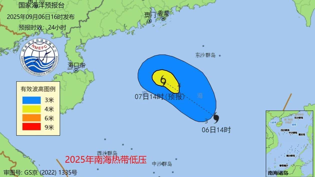 據央視新聞報道,記者從自然資源部獲悉,受南海熱帶低壓的影響,預計9月6日夜間到7日下午:南海北部將出現3到5米的大浪到巨浪區;廣東近岸海域將出現1.5到2.5米的中浪到大浪。