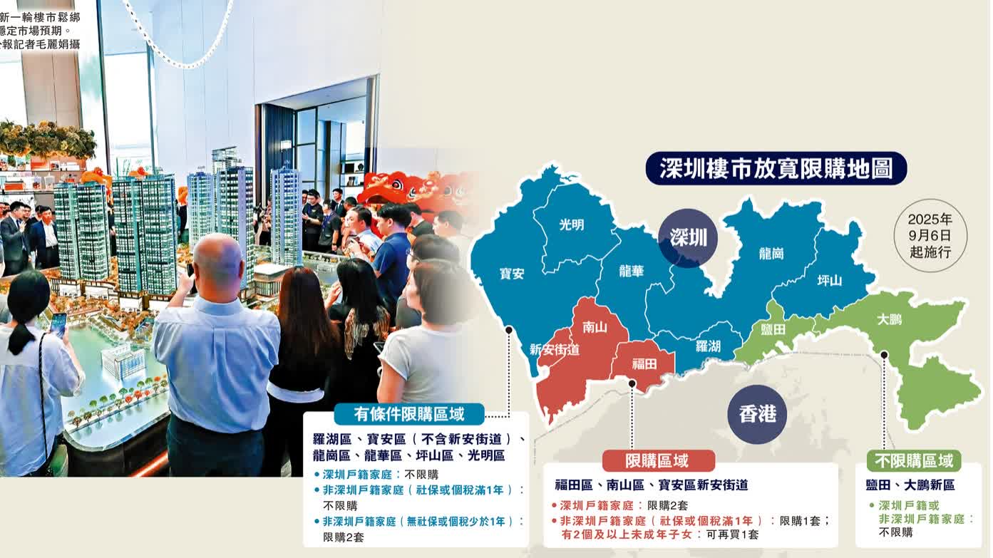 (大公報記者 毛麗娟 深圳報道)繼北京和上海後,深圳也發布新一輪樓市鬆綁措施。深圳戶籍居民、連續繳納社保或個人所得稅滿1年的非深圳戶籍居民在6個區域購房不限套數,無社保或個稅少於1年的非深圳戶籍居民限購2套,另有2個區域不再審核購房資格,自9月6日起施行。