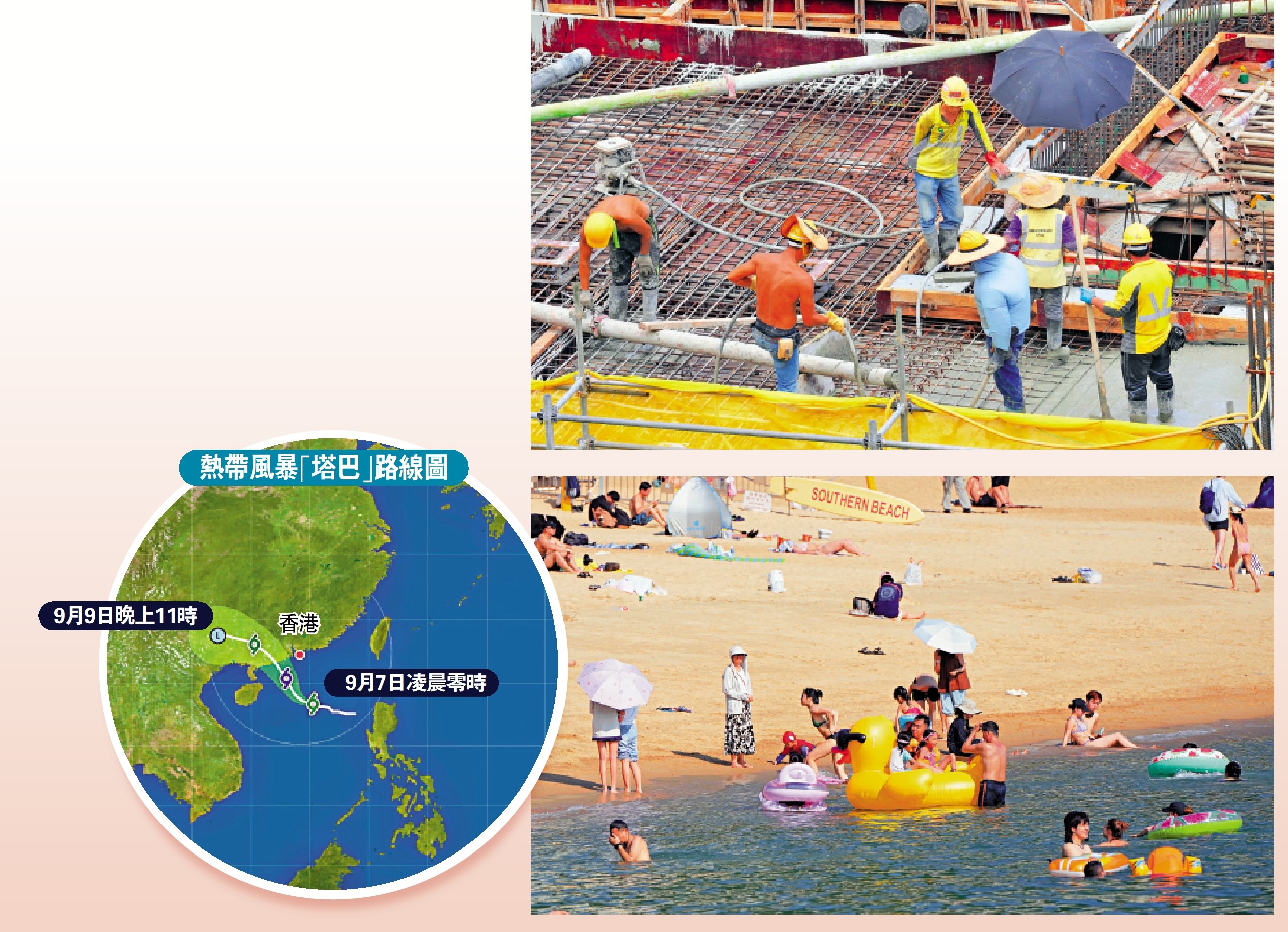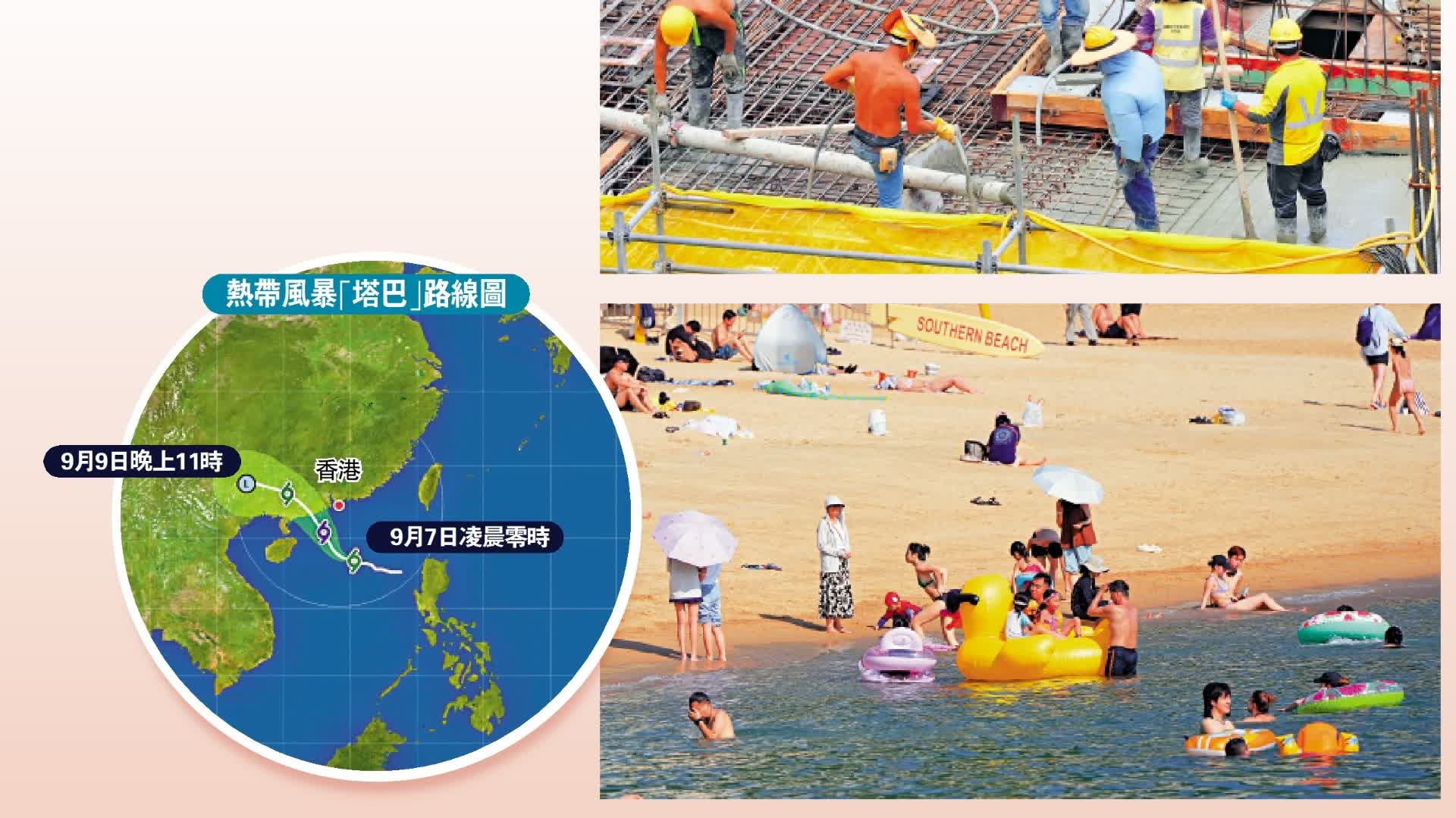 (大公報記者 莫思年)受到熱帶低氣壓逼近,外圍下沉氣流影響,本港昨日天氣異常酷熱,市區最高氣溫約35度,烈日猛曬,高溫煎熬,戶外工作的打工仔苦不堪言,而到海灘消暑的市民,亦有人撐傘抵擋猛烈陽光。