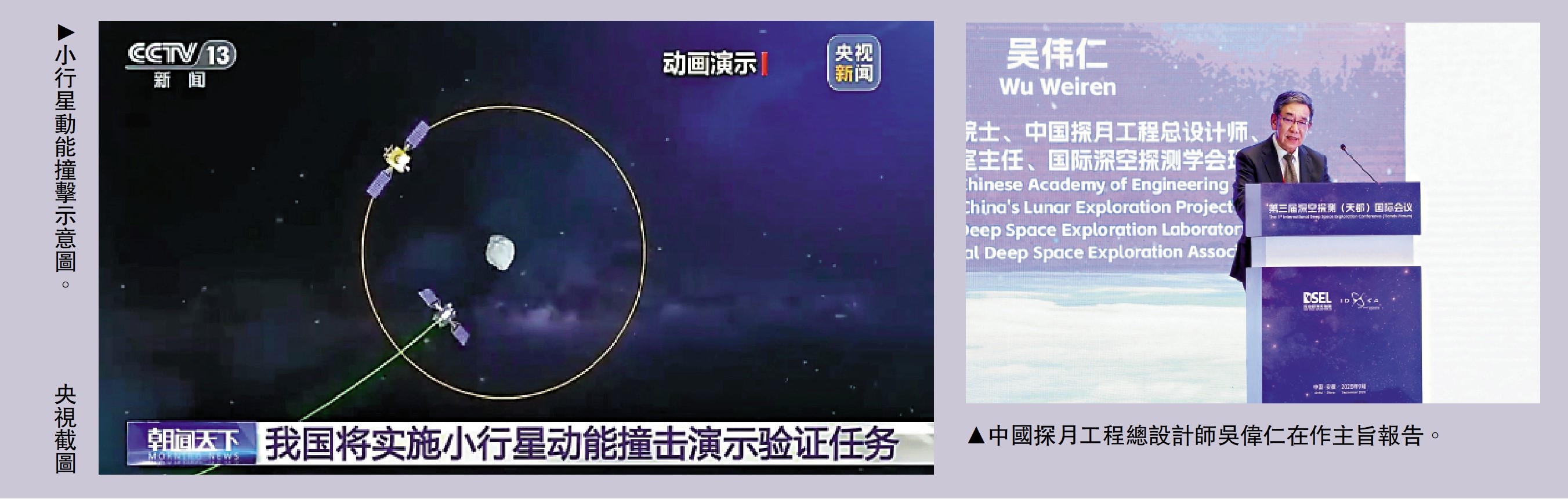 大公報綜合新華社、央視新聞報道,攜手全球夥伴,守衛地球家園。近日召開的第三屆深空探測天都國際會議上,中國探月工程總設計師吳偉仁介紹,「我國正在規劃對一顆小行星實施動能撞擊演示驗證任務,驗證小行星防禦方案可行性。」