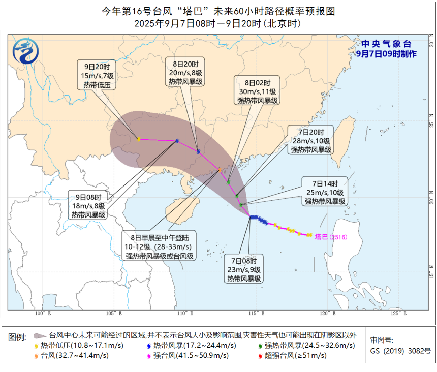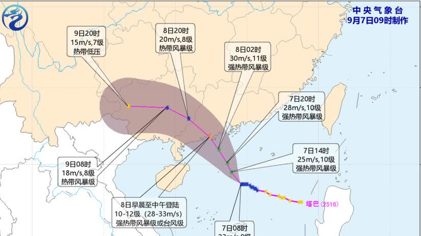 中央氣象台預計,「塔巴」未來24小時內將以15到20公里的時速向西北方向移動,強度逐漸加強,趨向廣東省中西部沿海,並將於8日凌晨到中午在珠海到湛江一帶沿海地區登陸。