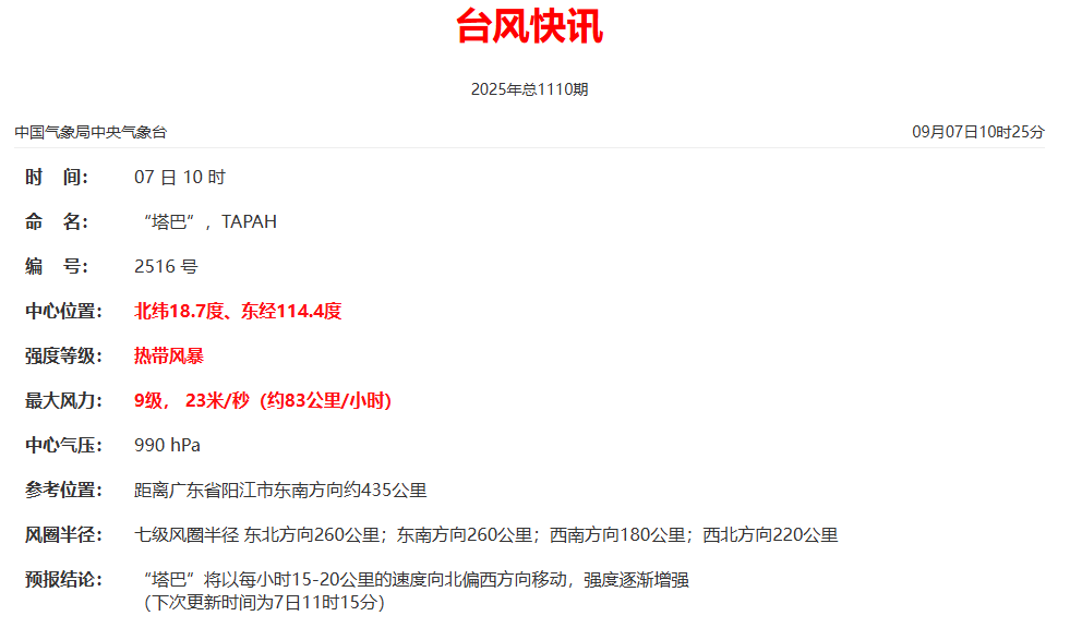 中央氣象台指,今早(7日)10時,「塔巴」(熱帶風暴級)中心位於北緯18點7度,東經114點4度,也就是在距離廣東省陽江東南方約435公里的南海北部海面上,中心附近最大風力9級,達到23米每秒的風速,中心最低氣壓990百帕,六級大風範圍半徑約360公里。
