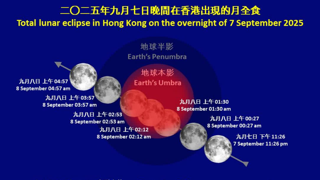 本次月食將在9月7日晚上11時26分開始,9月8日上午零時27分月球開始進入地球本影,至上午1時30分月球完全進入地球本影,即月全食開始。食甚時間為上午2時12分,至上午2時53分月球開始離開地球本影。月全食階段歷時1小時23分鐘,期間月亮不會從視線中完全消失,而是會呈現暗紅色。而整個月食的過程會在8日上午4時57分完結。
