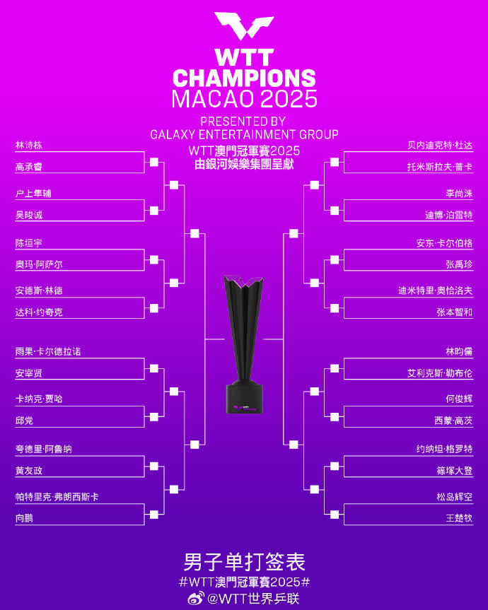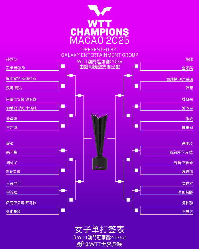 大公文匯網綜合報道,9月9日,2025年世界乒乓球職業大聯盟澳門冠軍賽(WTT澳門站)將在澳門東亞運動會體育館開拍,孫穎莎、王楚欽、林詩棟領銜中國隊出戰。今日(9月7日),單打簽表公布。