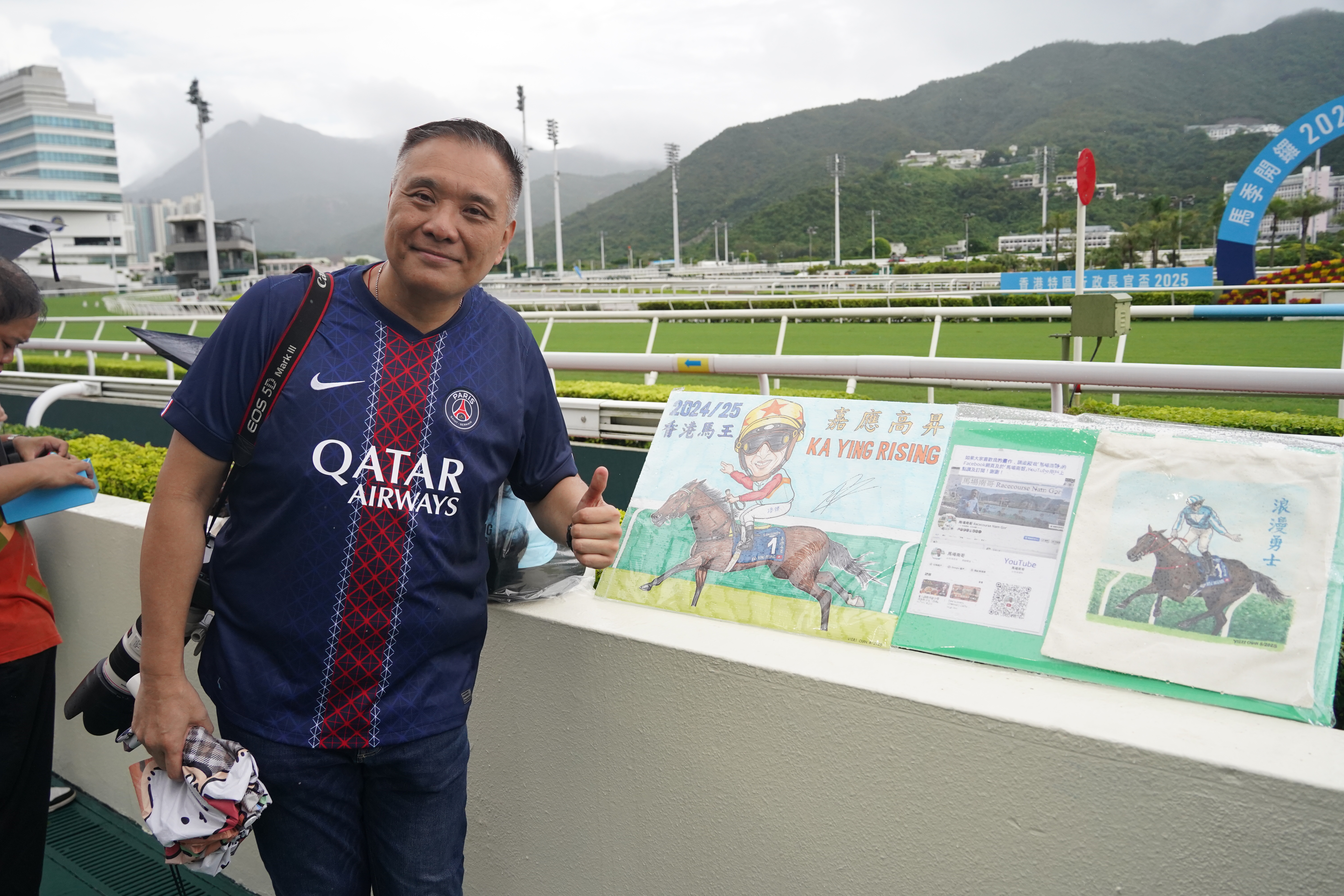 今日最開心的人之一當屬民間KOL畫家「馬場南哥」。他帶來自己畫的潘頓騎馬像,並成功拿到上屆冠軍騎師潘頓簽名及合照,「我要自己收藏呢幅畫,而家係無價寶。」