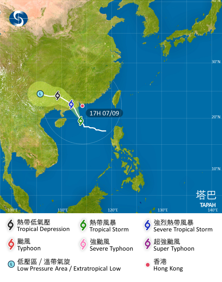 大公文匯全媒體報道,熱帶風暴「塔巴」迫近本港,天文台最新表示,會在今晚(7日)9時20分改發八號烈風或暴風信號,預計八號烈風或暴風信號會至少維持至明早(8日)11時。