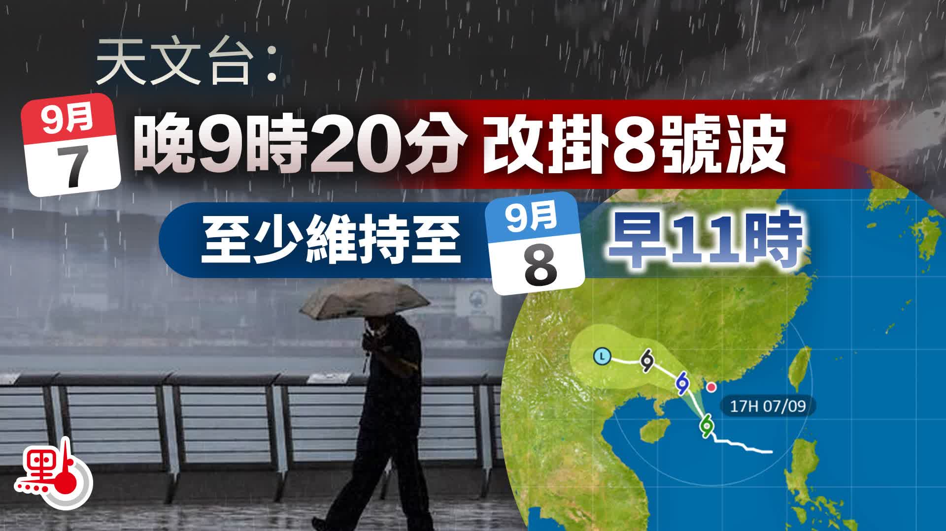 大公文匯全媒體報道,天文台今晚(7日)9時20分發出八號東南烈風或暴風信號。天文台表示,八號烈風或暴風信號會至少維持至明早11時。