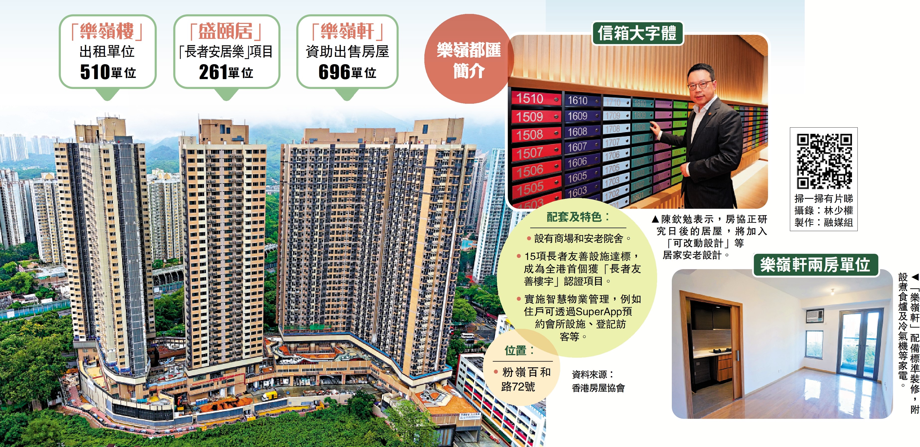「樂嶺都匯」是房協首個以「綜合發展模式」發展的專用安置屋邨,同時提供資助出售房屋「樂嶺軒」、出租房屋「樂嶺樓」,以及房協第四個「長者安居樂」項目「盛頤居」,合共提供1467個單位,並設有商場和安老院舍等。大公報記者上周率先直擊「樂嶺軒」及「盛頤居」現樓單位,其中「盛頤居」提供升級版長者友善設計,包括在大門附近設置「出門三寶」收納架、在浴室設置晾衣架等。