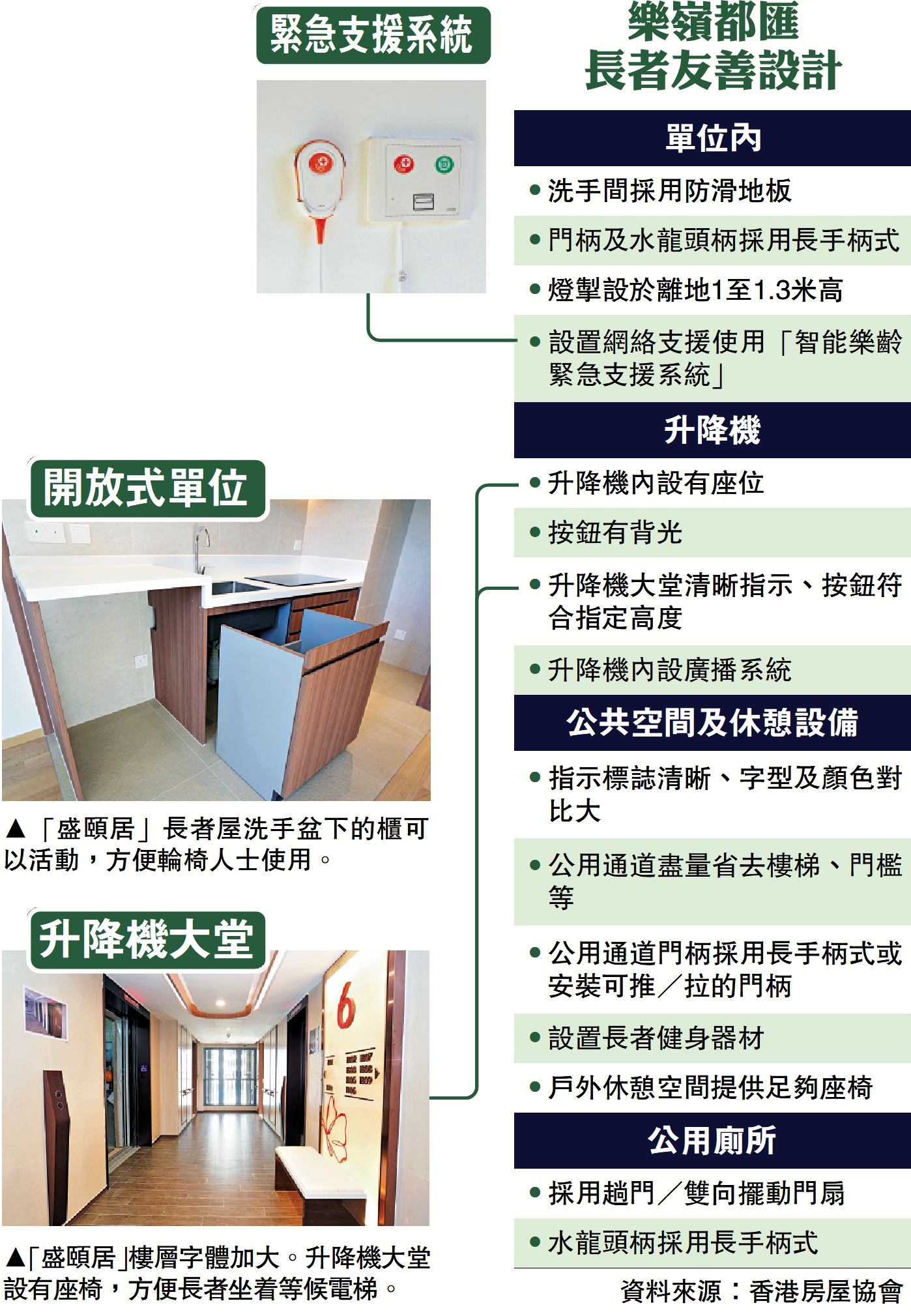 (大公報記者 曾敏捷〈文〉林少權〈圖〉)本港人口老齡化日趨嚴重,政府鼓勵居家安老,香港房屋協會在粉嶺的專用安置屋邨「樂嶺都匯」,首次將長者屋與出租及資助出售房屋綜合發展,並引入多項長者友善設計,包括在公共通道減少樓梯及門檻、在單位內設置網絡支援使用「智能樂齡緊急支援系統」等,成為全港首個獲「長者友善樓宇」認證的項目。