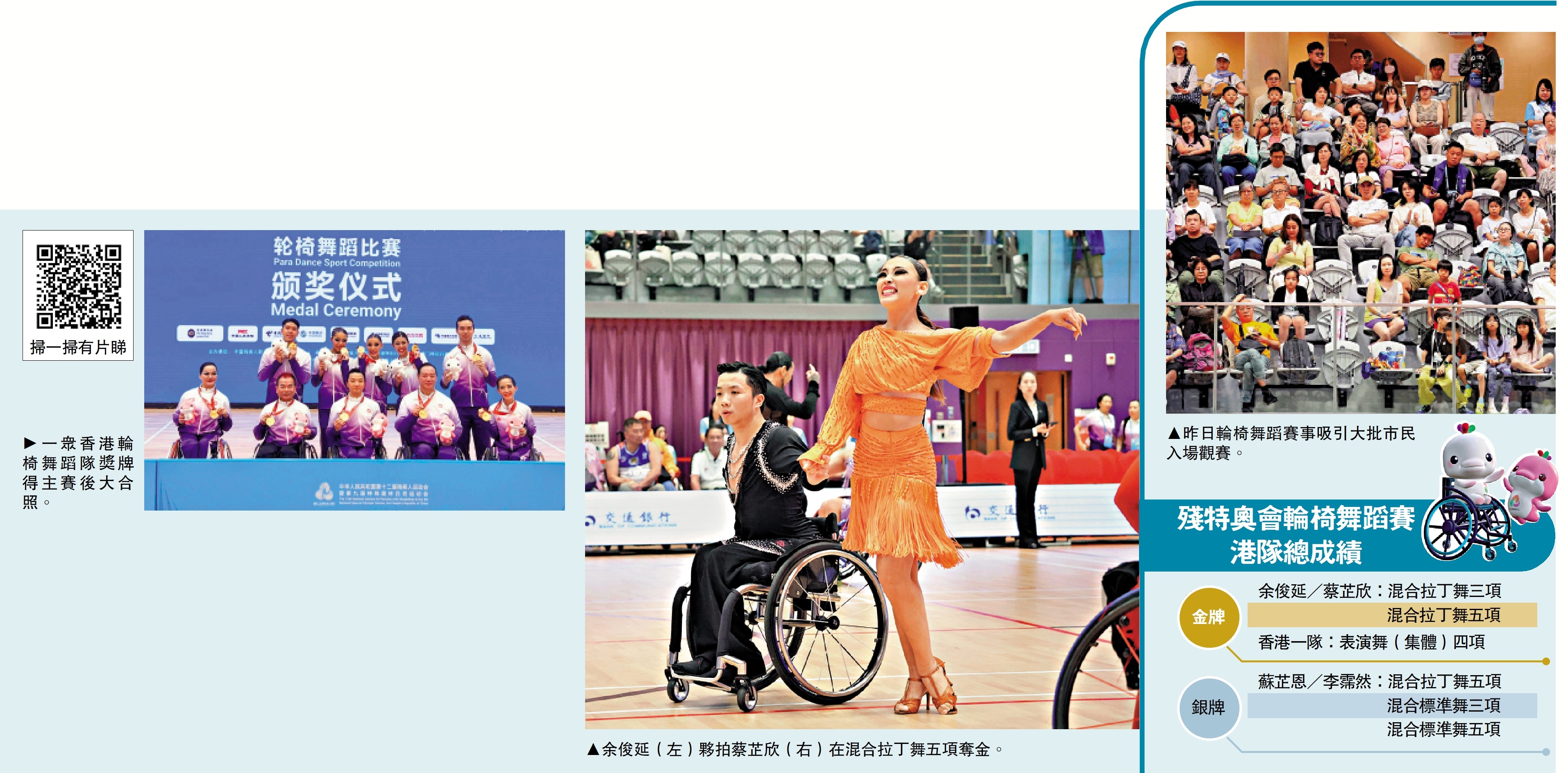香港輪椅舞蹈隊首日賽事先聲奪人奪得1金2銀,昨日表現更上一層樓。周日賽事包括雙輪椅標準舞五項、雙輪椅拉丁舞三項、混合拉丁舞五項及表演舞(集體)四項賽事,經過一日角逐,廣東隊的林浩欽/梁巧嬋奪得雙輪椅標準舞五項及雙輪椅拉丁舞三項兩枚金牌。港隊方面,首日奪得混合拉丁舞三項金牌的余俊延/蔡芷欣繼續出戰混合拉丁舞五項,最終再奪一金,而另一組合蘇芷恩/李霈然則取得混合拉丁舞五項銀牌,港隊在混合拉丁舞兩項共取得2金1銀,成為此項大贏家。隨後,港隊再派出兩隊出戰表演舞(集體)四項賽事,最終以余俊延領銜的香港一隊成功奪金,港隊亦以3金3銀的佳績順利收官。