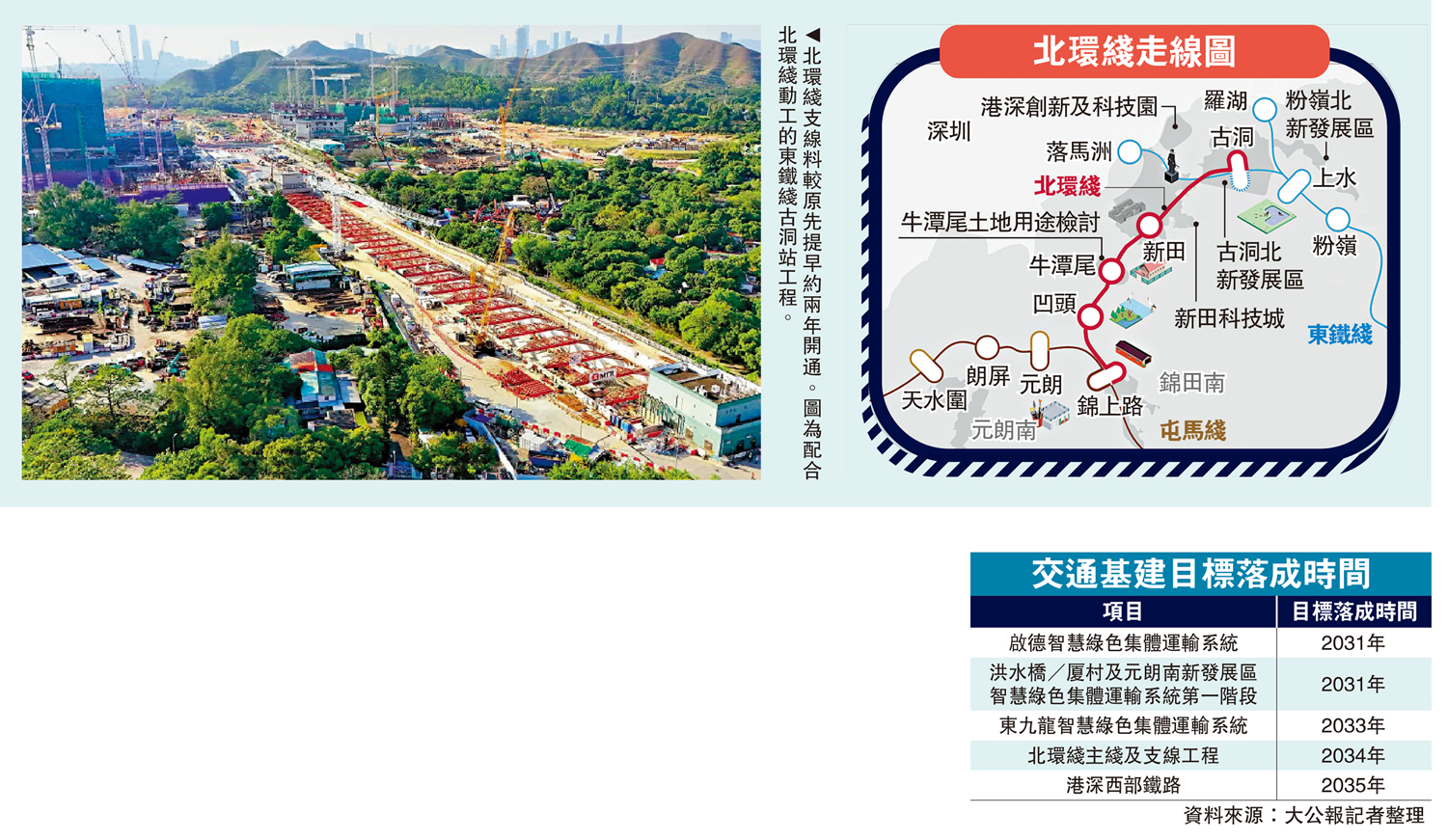 北部都會區交通基建正在全速推進,貫通北都多個新發展區的北環綫,將以「全盤規劃、分段推展」模式展開。特區政府與港鐵公司早前簽訂北環綫第一部分項目協議,確立主線部分融資及建造安排,並同步展開支線詳細規劃及設計,兩線預計可同步於2034年或之前開通,其中支線可較原計劃時間提早2年通車。