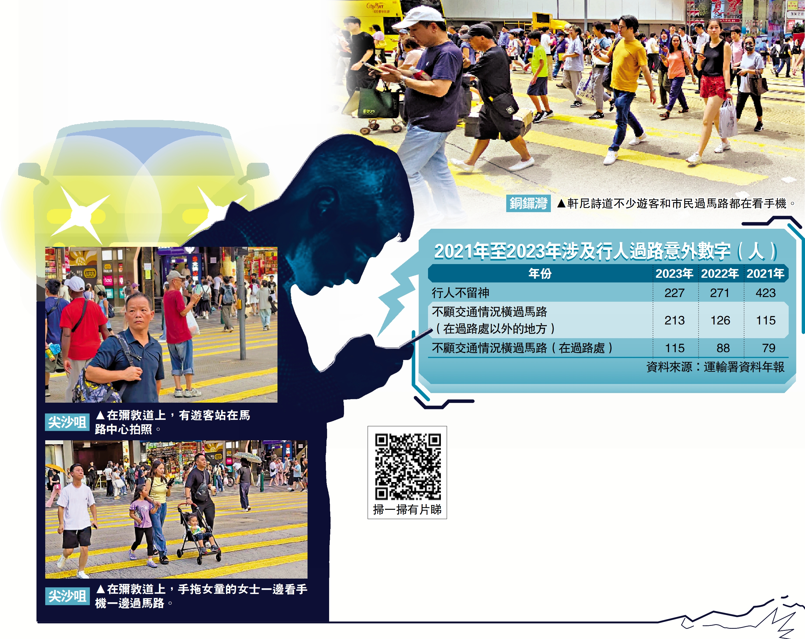 記者翻查運輸署資料年報顯示,在道路交通意外的主要成因中,過路處不顧交通狀況橫過馬路導致的傷亡人數呈上升趨勢,2021年為79人,2022年升至88人,2023年更增至115人,較2021年升四成半,不少個案或與行人過馬路看手機有關。