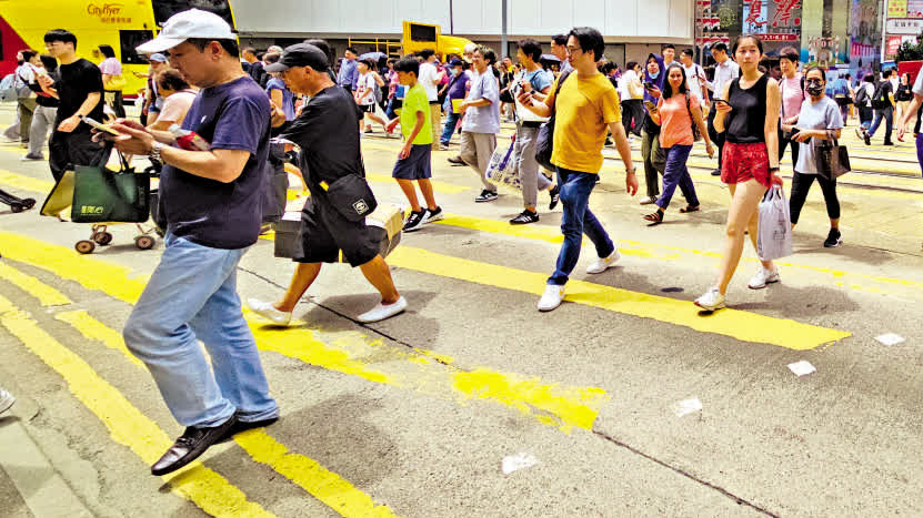 大公報記者近日在中環、灣仔、銅鑼灣和天后一帶觀察,發現在過路處不少人過馬路期間繼續使用手機。在港鐵天后站附近的英皇道,一名女童全程低頭看着手機過馬路,完全依賴身旁的女傭引領前行。中環畢打街的午飯時間,不少人過路時,甚至車輛中穿梭仍注目手機。有送貨員推着手推車過路,同時間在手機上查看地圖;數名白領在過馬路時翻看手機的資料。銅鑼灣軒尼詩道遊客眾多,一些外國遊客過馬路時,仍在手機查看資訊。
