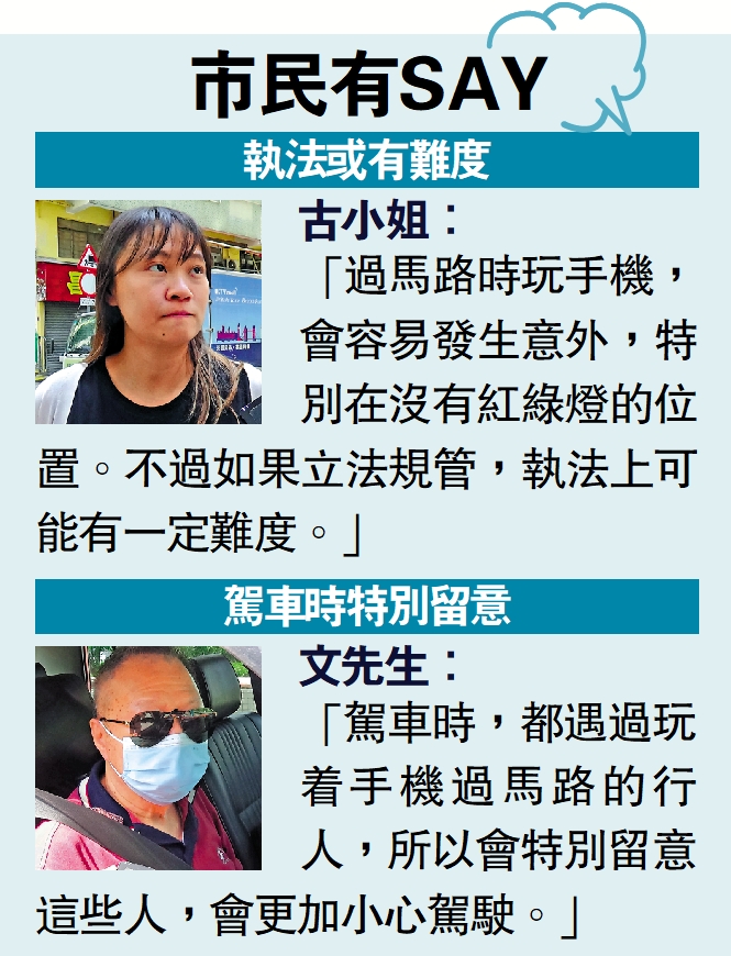 不少鄰近地區對「低頭族」制定法規及採取行動,本港立法會議員及專家均表示,相關地區的做法可供參考,但解決問題的關鍵在於加強教育與宣傳,讓市民深刻認識到「馬路如虎口」,切勿看手機分心,累人累己。