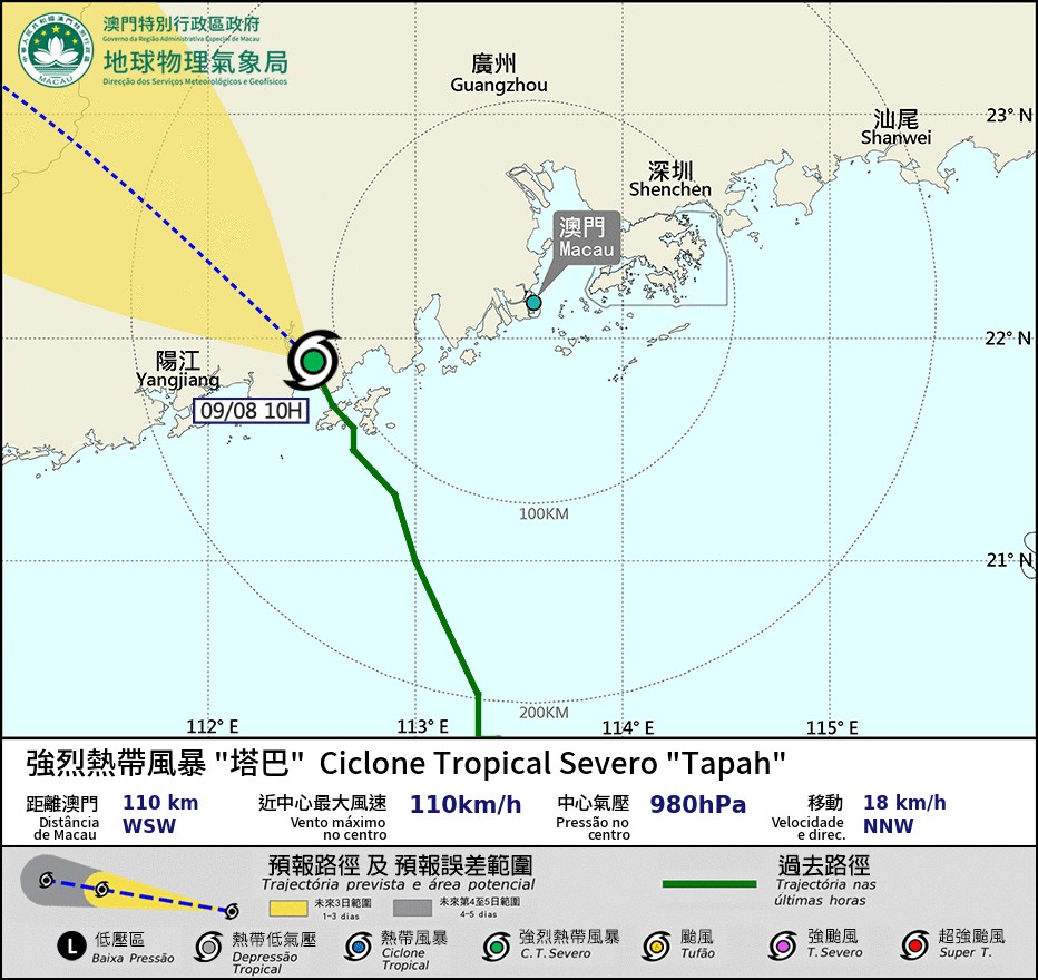 澳門氣象局指,「塔巴」已在廣東台山市登陸,但持續受其中心附近最大風力區域影響,未來數小時澳門風力將會維持7至8級及有強陣風,並伴隨頻密大驟雨及雷暴。因此,八號風球將於上午維持。