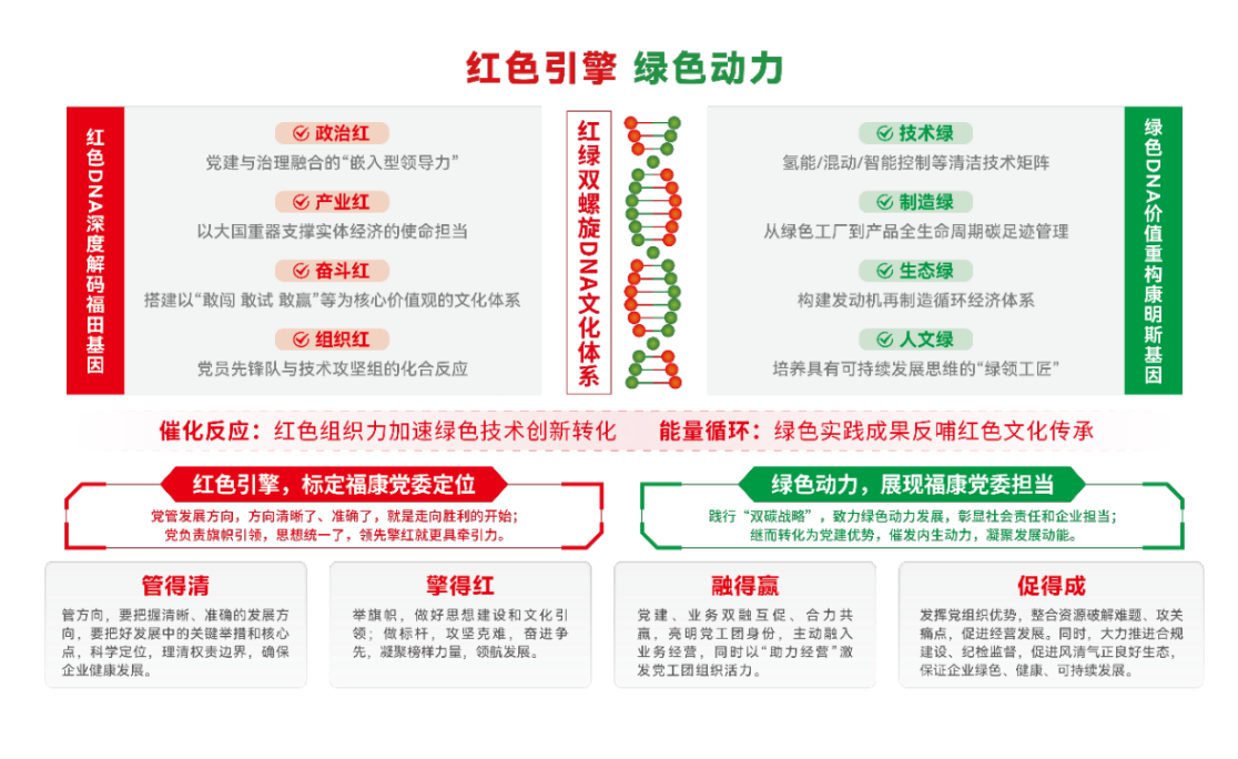 據了解,福康黨委創造性提出「紅綠雙螺旋DNA」發展模型,以「紅」傳承中國共產黨的政治優勢和紅色基因,以「綠」融匯康明斯先進技術、精益製造與可持續發展理念,兩者相互賦能、協同進化,成為驅動企業智能製造的核心動力,成為昌平區先進製造集群的「龍頭引擎」,為北京建設國際科技創新中心提供堅實支撐。