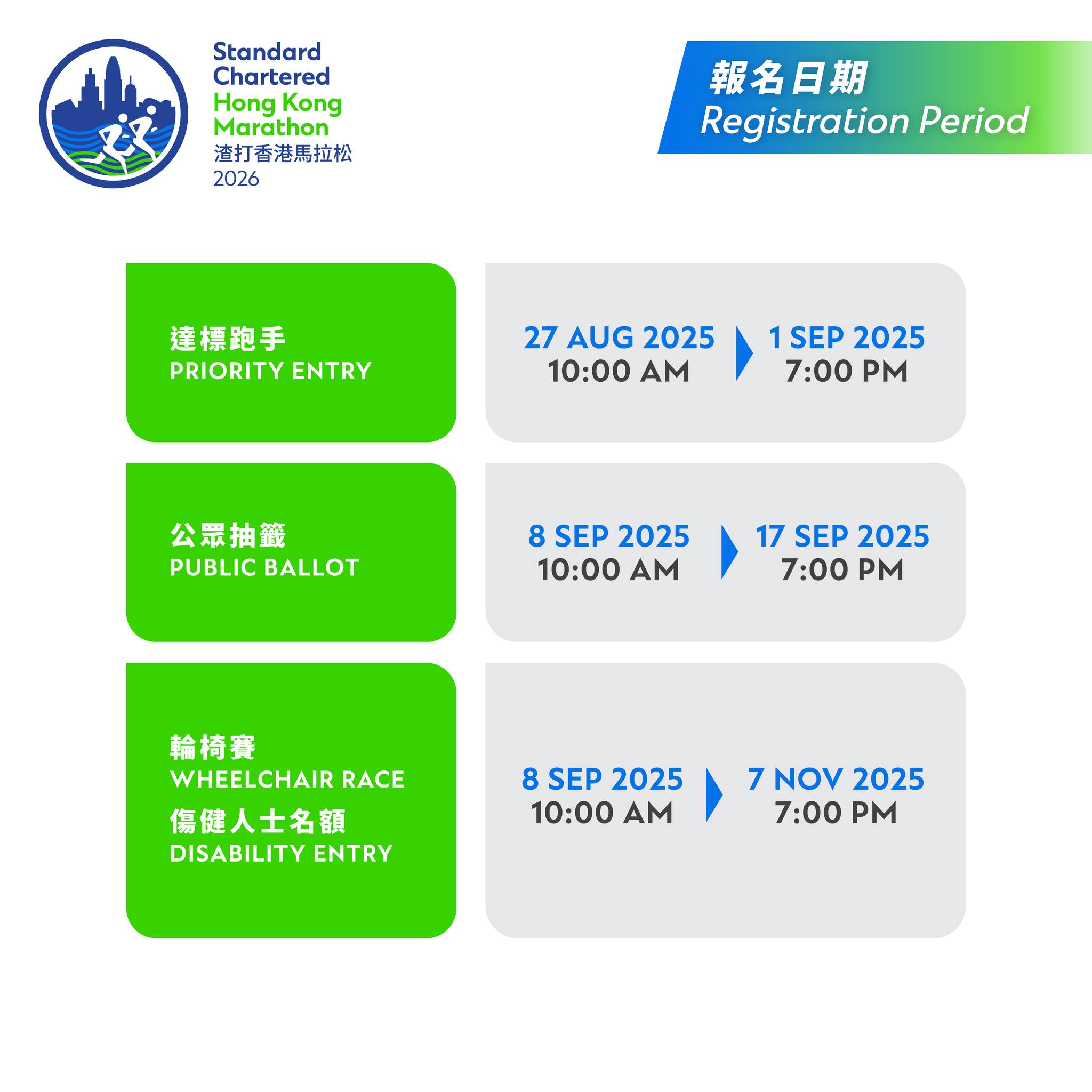 公眾抽籤將由9月8日(星期一)上午10時正開始,至9月17日(星期三)晚上7時正截止。至於輪椅賽組別,報名期則由9月8日開始,至11月7日為止。