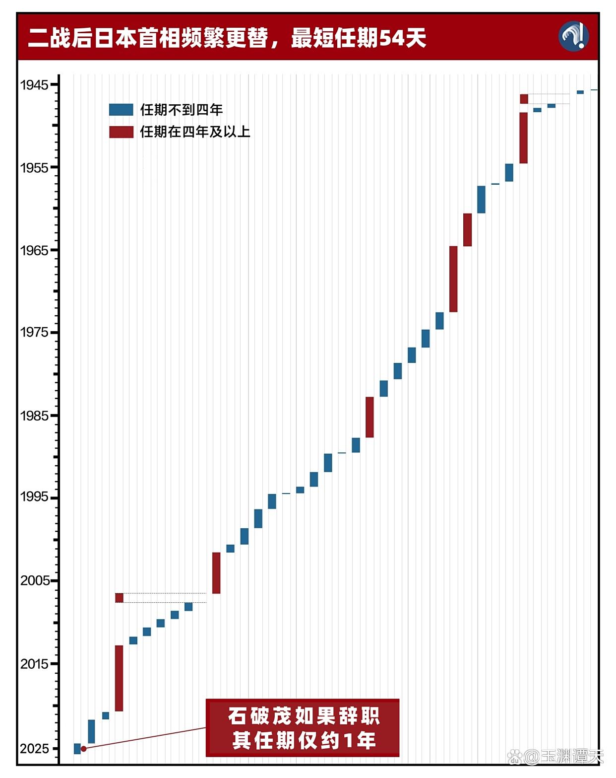 大公文匯全媒體報道,日本首相石破茂周日(7日)宣布辭職,自言這是避免執政自民黨發生重大分裂的「艱苦決定」,表明不會參與下屆黨總裁選舉。日本首相,又稱內閣總理大臣,是日本的政府首腦,領導內閣行使憲法所賦予的行政權。1945年以來,日本首相頻繁更替猶如走馬燈。其中,在職時間最短的首相東久邇宮稔彥王僅執政54天。