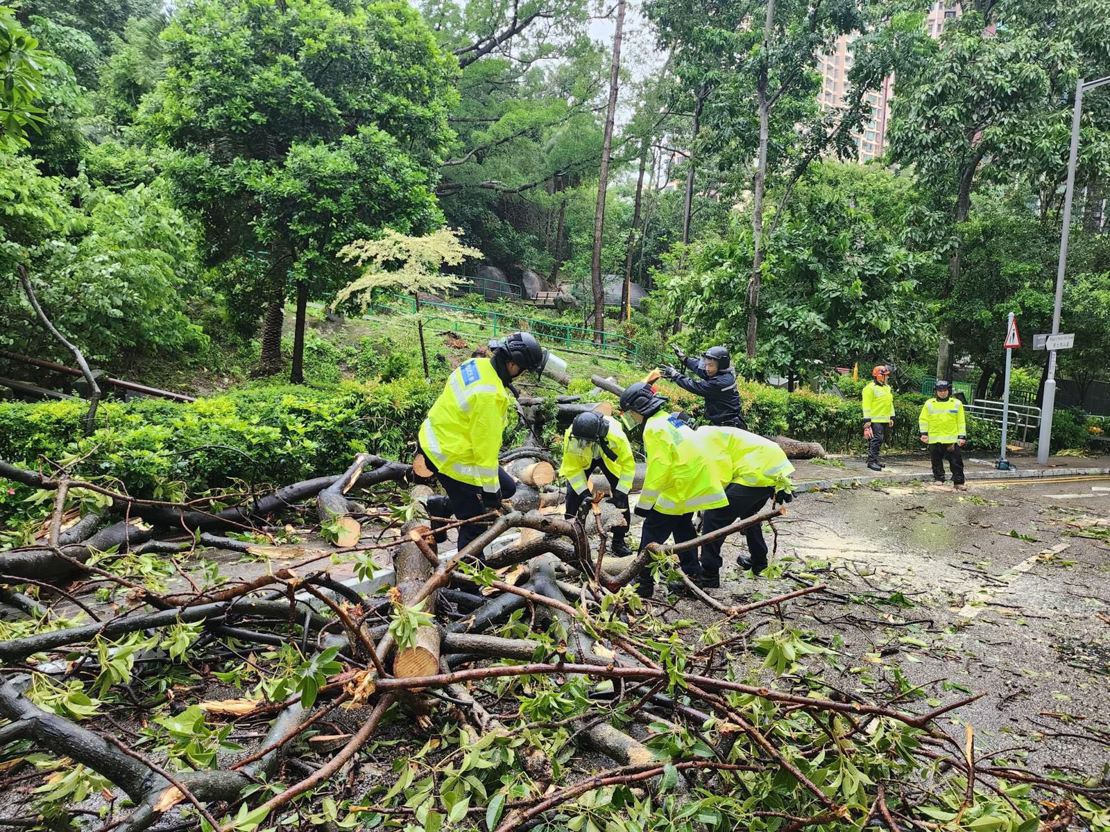 下午約2時52分,茶果嶺道近港鐵油塘站對面一棵大樹倒塌,壓中一個露天停車場內的5部車輛,停車場負責人發現後報警,同時通知車主。消防到場以電鋸清理樹枝和樹幹。其中3部車的車主到場駛走座駕,餘下兩部車,有待消防協助清理樹枝後才可駛離。