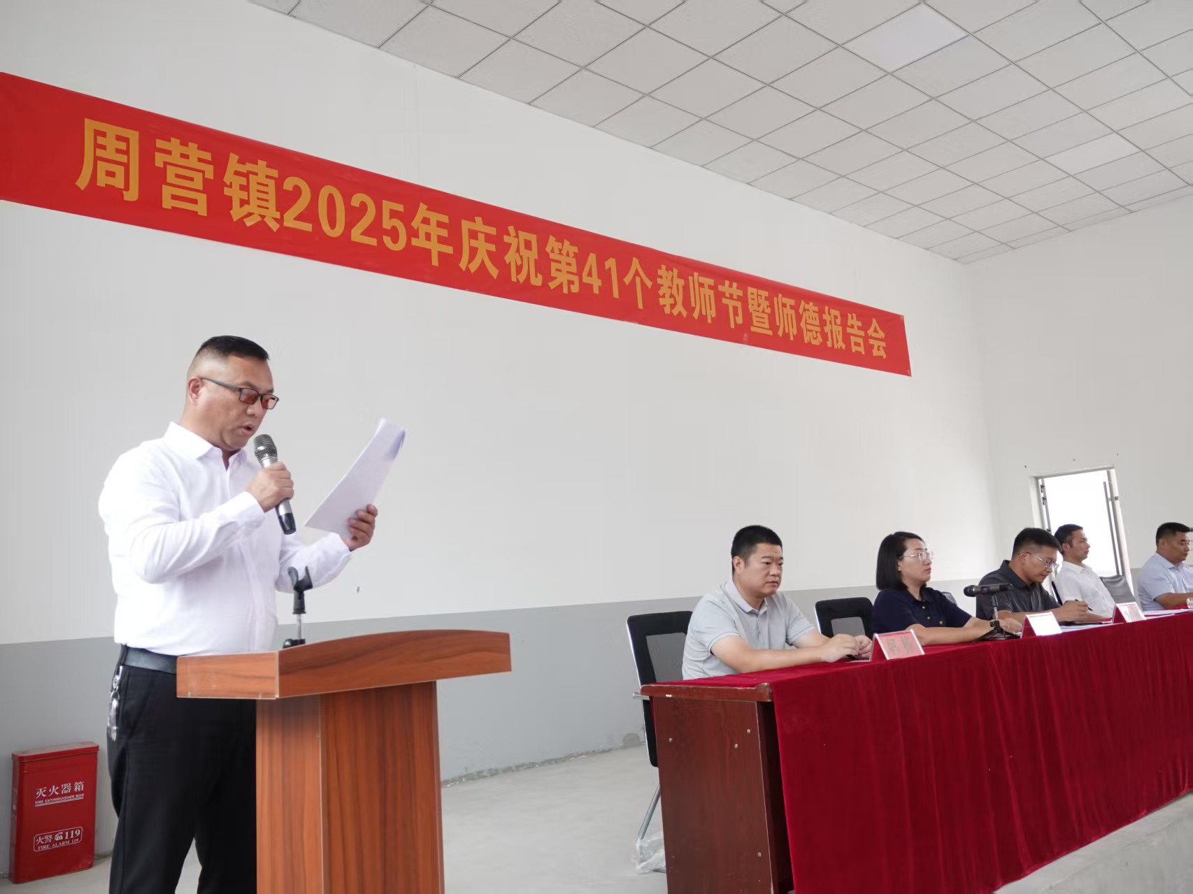 周營鎮黨委書記程健,黨委副書記、鎮長殷瑞,縣教體局總督學張璞,黨委委員、副鎮長劉銘威,黨委委員、紀委書記韓棟,中心校校長王繼華,愛心企業家代表,重點村黨支部書記,全鎮教職員工等400餘人參加大會。黨委副書記、鎮長殷瑞主持會議。