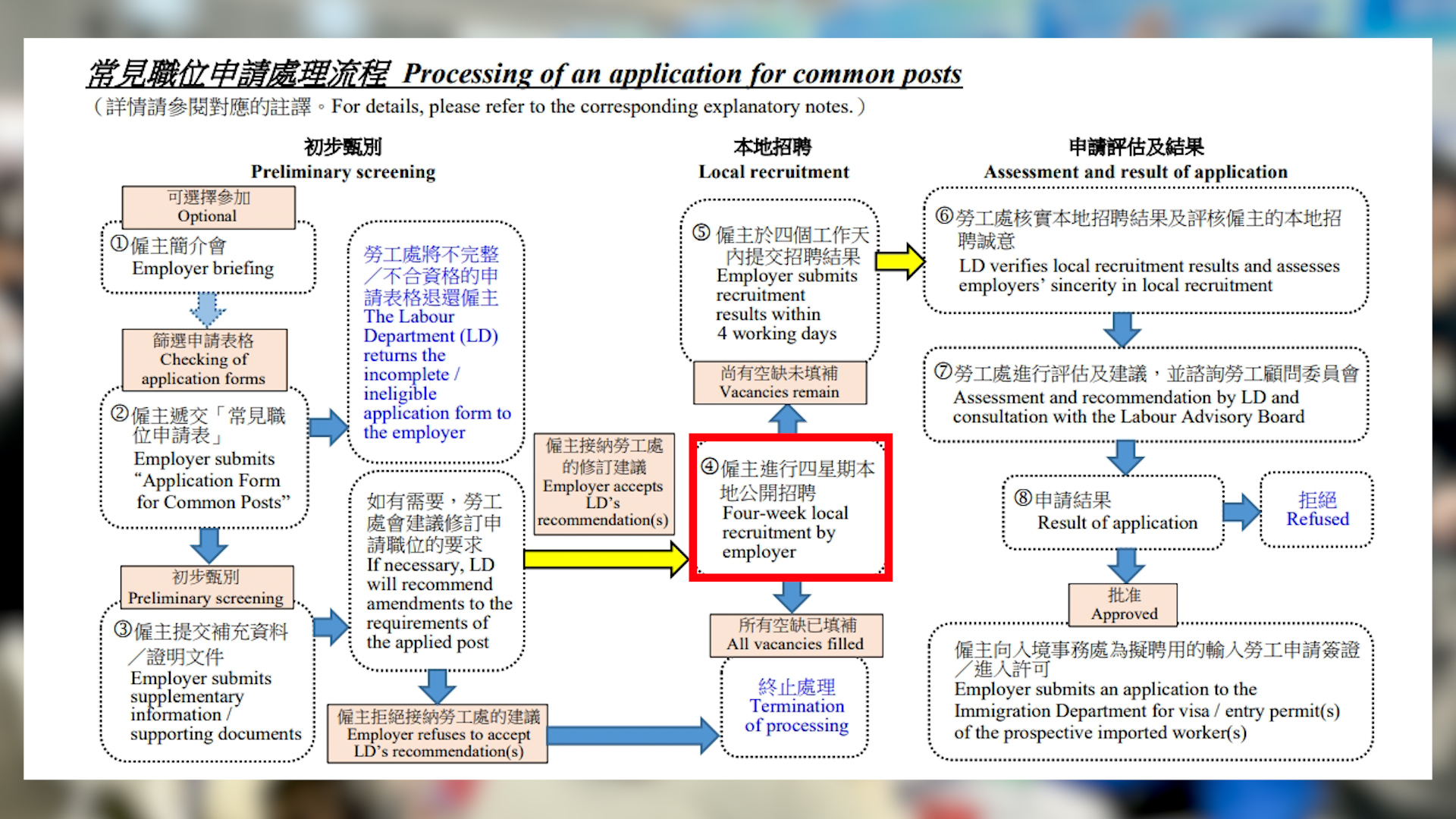 就此,勞工處回覆指,僱主完成本地招聘程式後,須向勞工處匯報結果並遞交招聘廣告作核對,處方會聯繫每名不獲聘用的本地求職者,了解面試詳情,並確定僱主匯報不聘用的原因是否與事實相符及合理,從而評估僱主是否有誠意聘用本地工人。如有證據顯示僱主違反本地招聘的規定,或無合理理由拒絕聘用合資格的本地求職者,勞工處會中止處理有關申請,並會考慮施加行政制裁,拒絕處理有關僱主在隨後一年提交的其他申請。