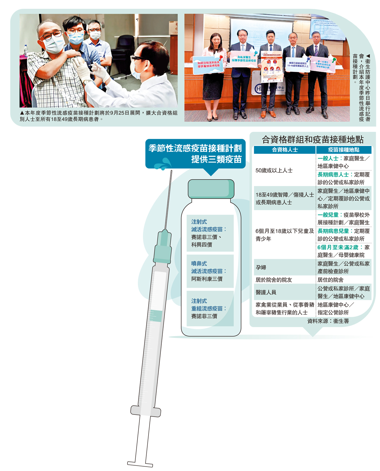 (大公報 記者 易曉彤)季節性流感活躍程度呈上升波幅,本年度季節性流感疫苗接種計劃將於9月25日展開,為進一步提高疫苗覆蓋率,政府推五大新猷,包括擴大合資格組別人士至所有18至49歲長期病患人士可免費打流感針,推出先導計劃為私家醫生採購10萬劑流感疫苗以協助穩定疫苗供應,以及進一步優化季節性流感疫苗學校外展計劃等。