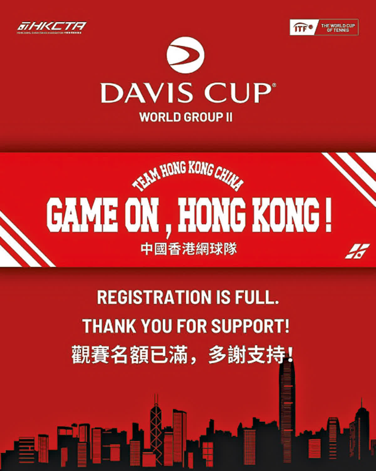 中國香港網球總會昨日在社交媒體公布,中國香港隊對陣烏茲別克斯坦隊的戴維斯盃世界Ⅱ組賽事的網上登記觀賽門票在15分鐘內額滿,本周末的維多利亞公園網球場將出現「爆棚」盛況,為港隊營造熱烈的主場氣氛。黃澤林期待看到球場滿座,觀眾的大力支持會給予港隊健兒更多能量。