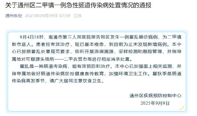 9月4日18時,南通市第三人民醫院報告我區發生一例霍亂確診病例,為二甲鎮新市居人。患者經有效治療,現已基本痊癒,到目前為止未發現新增病例。本中心已按照霍亂處置規範要求,組織開展流調溯源、採樣檢測和跟蹤管理,並指導屬地對可疑源頭場所——二甲農貿市場進行相應消殺處置。