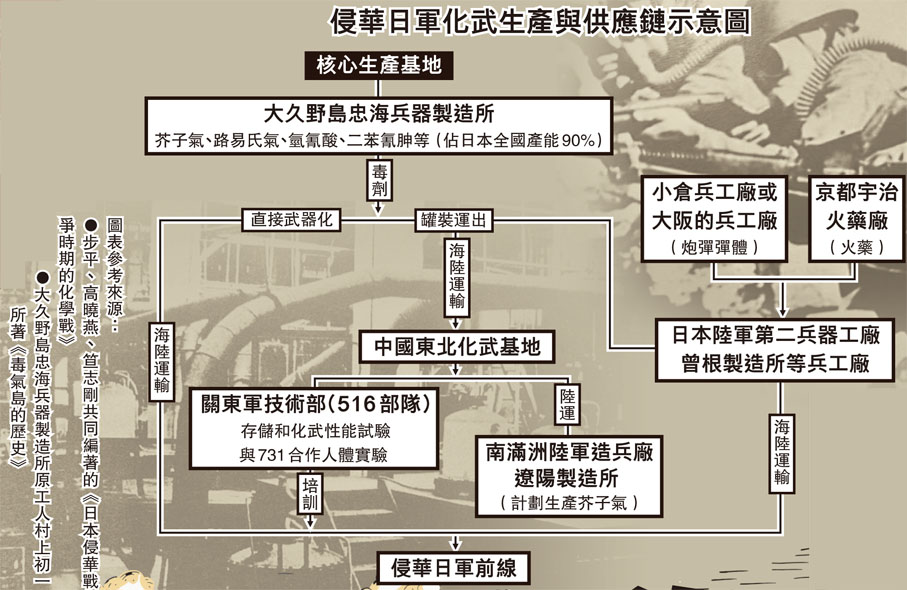 廣島旁的大久野島綠樹成蔭,是現時日本休假旅遊勝地,每年都吸引眾多年輕人休閒娛樂。但很多人不知道,這個美麗的小島,曾因日軍秘密研製化學武器而被刻意於地圖中抹除。「大久野島上的忠海兵器製造所,是日本侵華期間化武製造的主要基地之一。其生產的化學毒劑,一部分在本廠直接武器化,一部分被運往其他工廠進行武器裝填,還有一部分以罐裝毒劑形式被送往中國戰場。」高曉燕說。