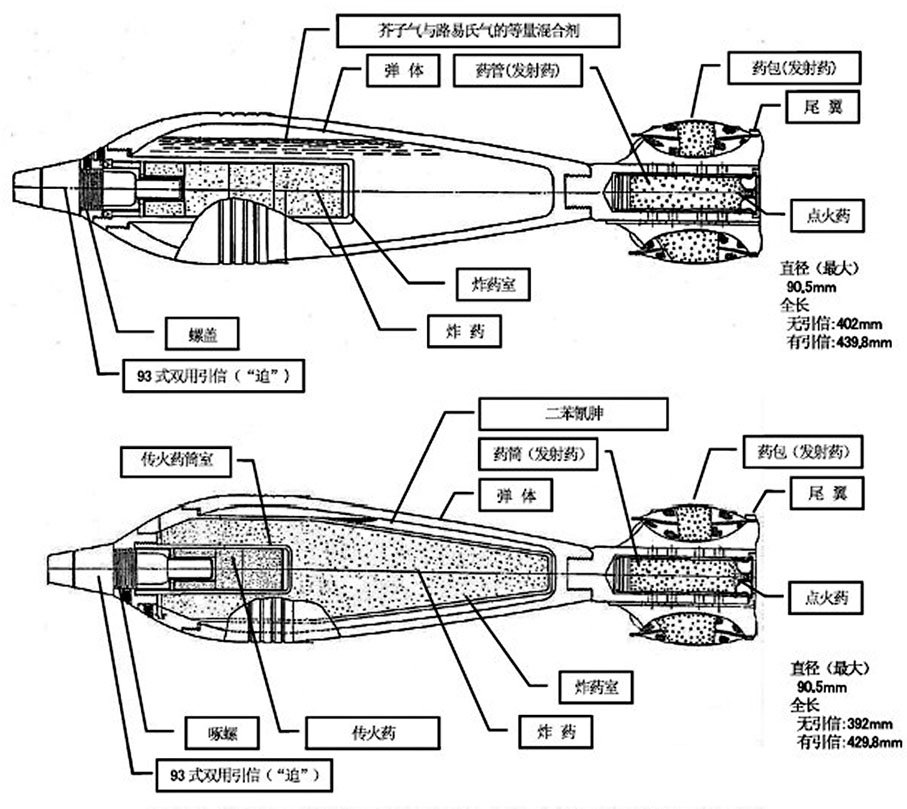 據侵華日軍「九四式輕迫擊炮彈九五式特種彈彈藥筒說明」,由芥子氣與路易氏氣混合劑填充的黃彈「主要通過撒播糜爛性持久毒物來殺傷人、馬,或是妨礙敵人利用和佔據某地點。」1枚黃彈爆炸,周邊100㎡內的散毒量達每平方米1g到5g左右,可使範圍內的人、馬喪失戰鬥力。日本陸軍曾指出約3.5g芥子氣液滴沾上人的皮膚,「數小時後會出現症狀,數日後致死」,約2.4g路易氏氣的液滴沾上人的皮膚,「10分鐘後會出現症狀,一周後斃命」。而填充了二苯氰胂的赤彈爆炸時,會產生高約5m、寬約10m的毒幕。「暴露其中15分鐘就會削弱戰鬥能力」。