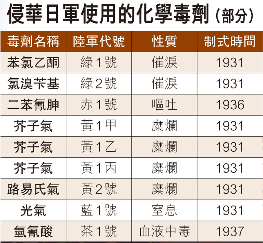 日本歷史學者粟屋憲太郎、吉見義明、松野城也在他們編撰的《毒氣戰相關資料》和《毒氣戰相關資料Ⅱ》等書所引用的侵華日軍絕密資料顯示:至1941年底,日軍大本營(指日本參謀本部)至少向中國戰場補給了各類毒劑炮彈45萬枚,毒劑航彈7,700枚,毒煙筒約100萬枚,以及散裝毒劑68噸﹔1941年后,又補給了大量化武,總數達到數百萬枚。