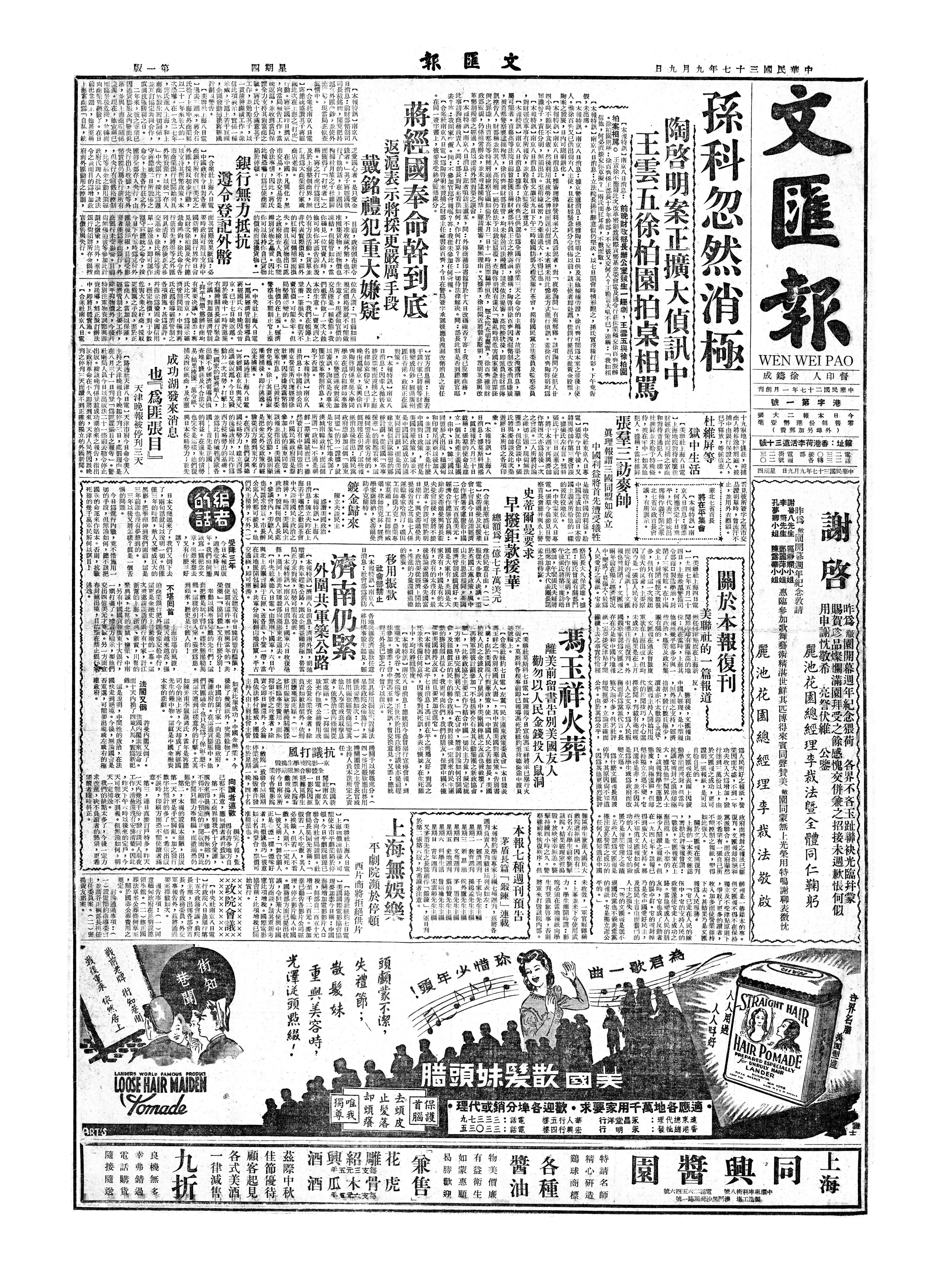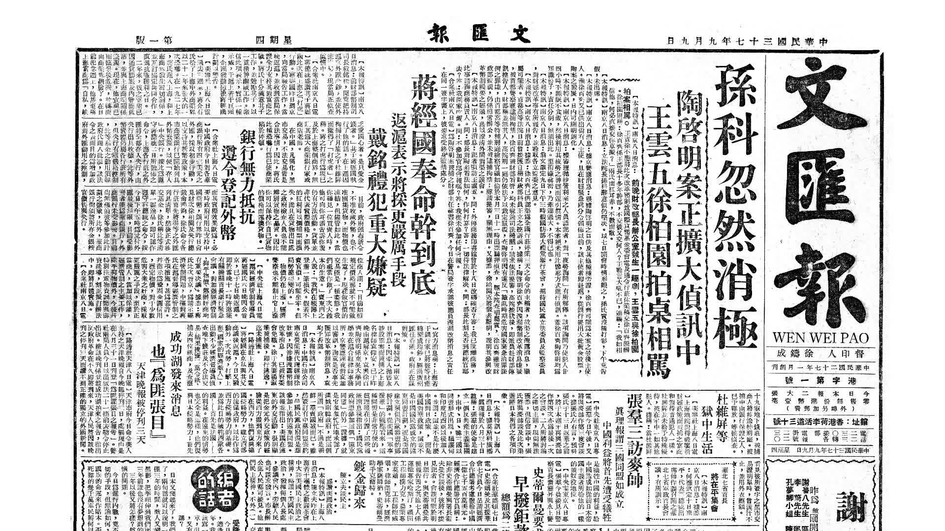 1948年9月9日和10日,香港《文匯報》連續兩日刊登通訊,預測國民黨政府金圓券政策必敗。