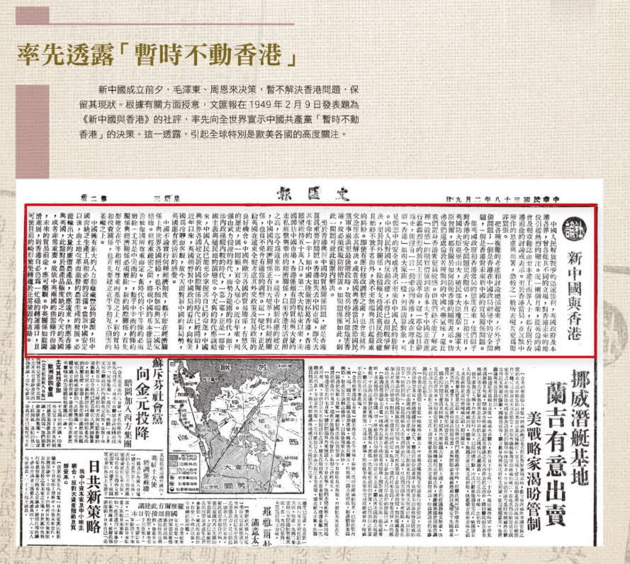 新中國成立前夕,香港《文匯報》率先向全世界透露,中國「暫時不動香港」的決策。
