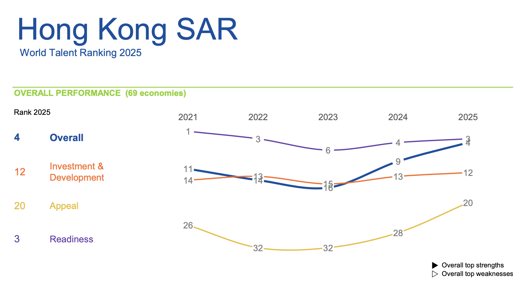 「投資及發展」的總排名則上升1名至第12名。當中值得留意是「員工培訓」(Employee training)上升5位,顯示香港企業對培訓員工越趨重視,這亦是香港得以吸引人才的重要因素。