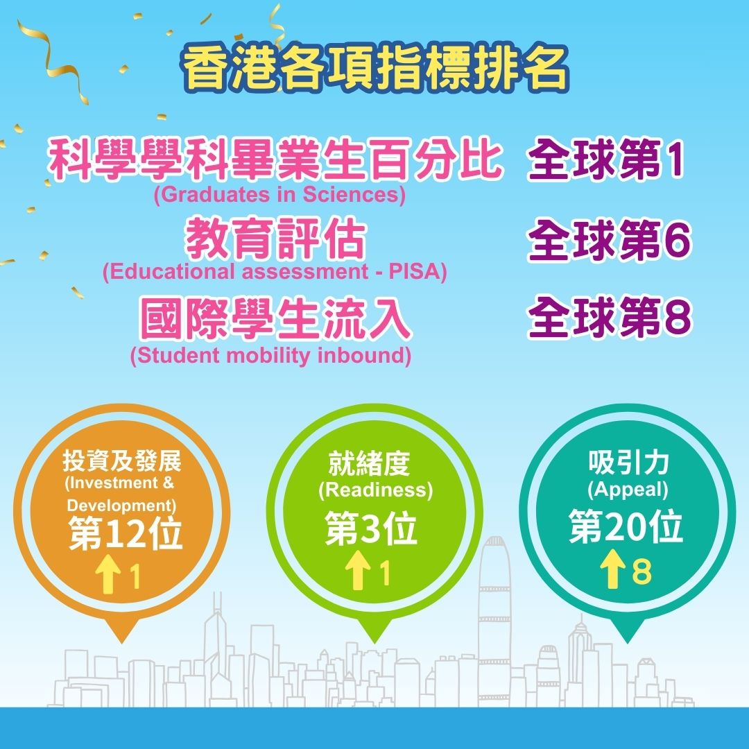 蔡若蓮表示,在各項指標中,香港的科學學科畢業生百分比繼續高踞全球第一,反映一直加強STEAM教育及數字教育的成果,有效培育學生的創意和解難能力,提升師生的數字素養。