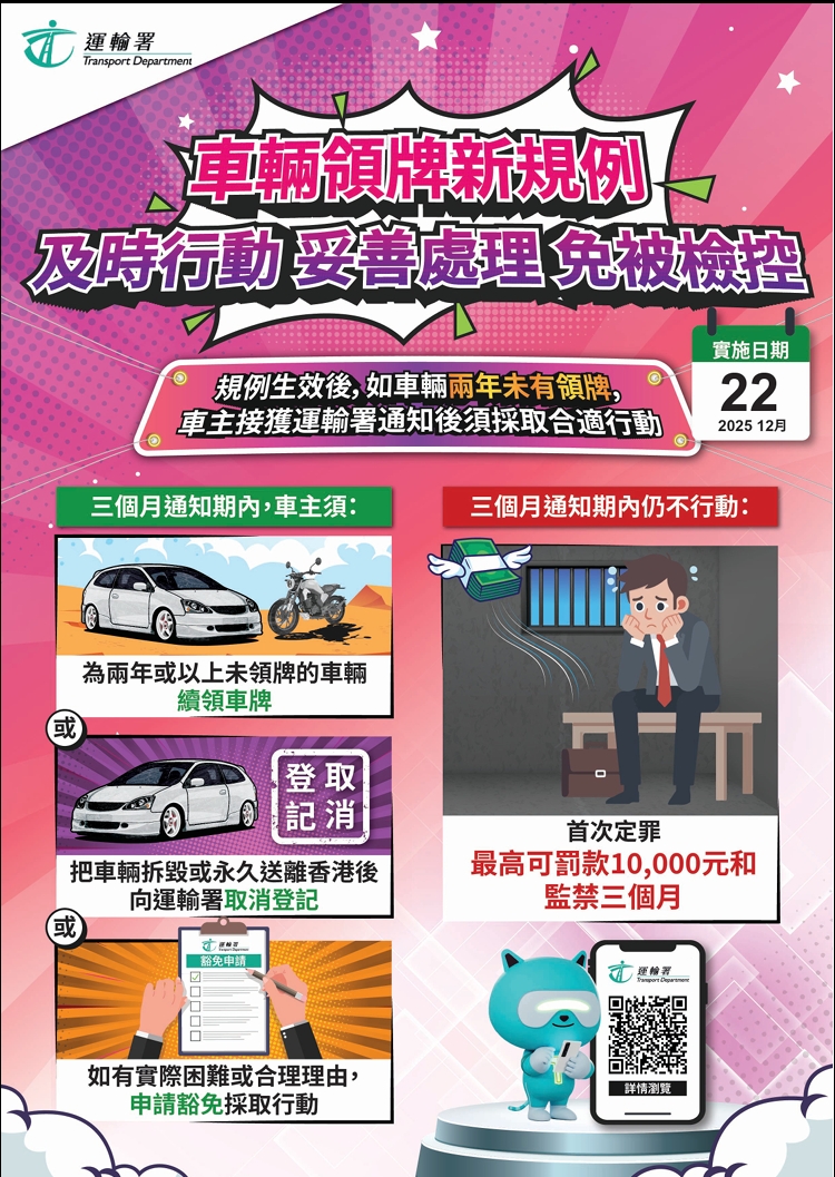運輸署發言人表示,由12月22日起,署方將向2年或以上未領牌車輛的登記車主發出通知書,要求車主必須在發出通知書日期的3個月內為車輛領牌,或把車輛拆毀或永久送離香港後向署方取消登記。車主須及時妥善處理車輛,以免觸犯法例。