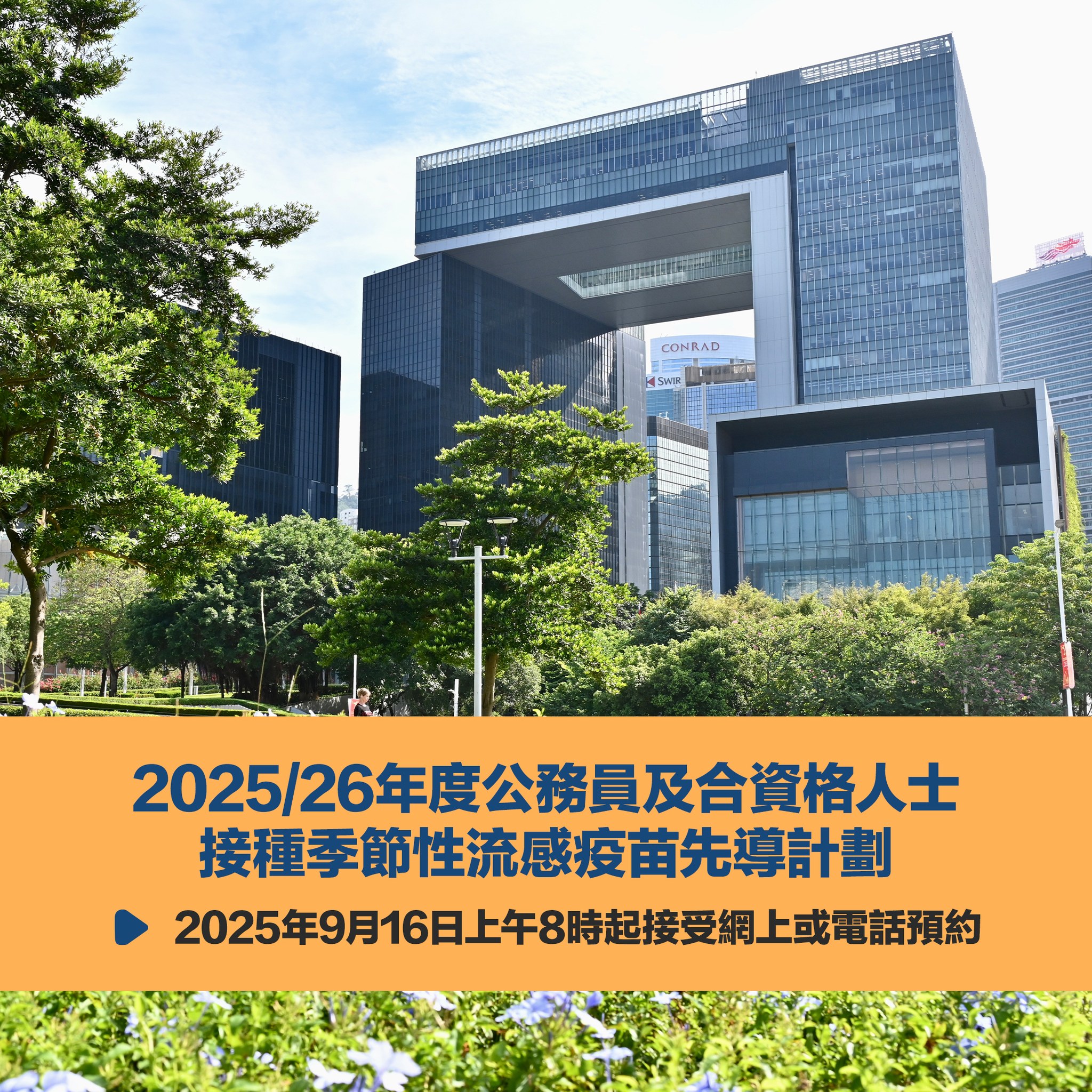 公務員事務局局長楊何蓓茵今日在社交專頁表示,為進一步方便在職公務員接種流感疫苗,政府會以試點方式,於10月中至11月期間在指定政府辦公大樓,提供外展接種服務。