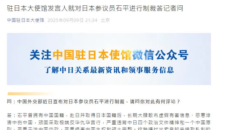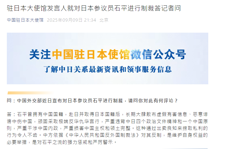 大公文匯全媒體報道,9月8日,外交部宣布對日本參議員石平採取反制措施。中國駐日本大使館今日(9日)對此作出回應。