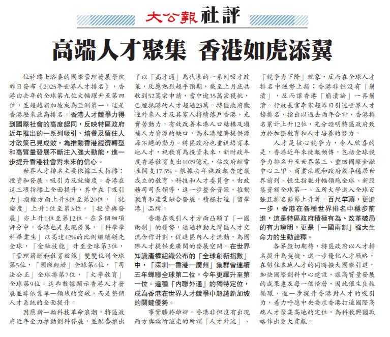 位於瑞士洛桑的國際管理發展學院昨日發布《2025年世界人才排名》,香港由去年的全球第九位大幅躍升至第四位,並超越新加坡成為亞洲第一,這是香港歷來最高排名。香港人才競爭力得到國際社會的高度認同,反映特區政府近年推出的一系列吸引、培養及留住人才政策已見成效,為推動香港經濟轉型和高質量發展不斷注入強大動能,進一步提升香港社會對未來的信心。