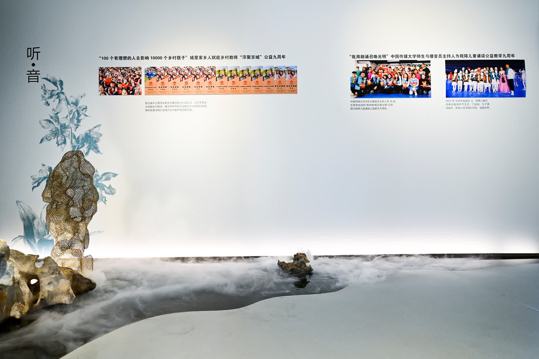 而在《聲音·公益》展區,藝術展的另一深層價值得以充分體現。連續開展九年的「我用朗誦召喚光明」視障兒童公益教學項目,與同樣持續九載的「萍聚京城」鄉村教師賦能計劃,共同呈現了聲音如何切實地轉化為改變現實的力量。聲音,在這裏成為一種溫柔的公共力量。