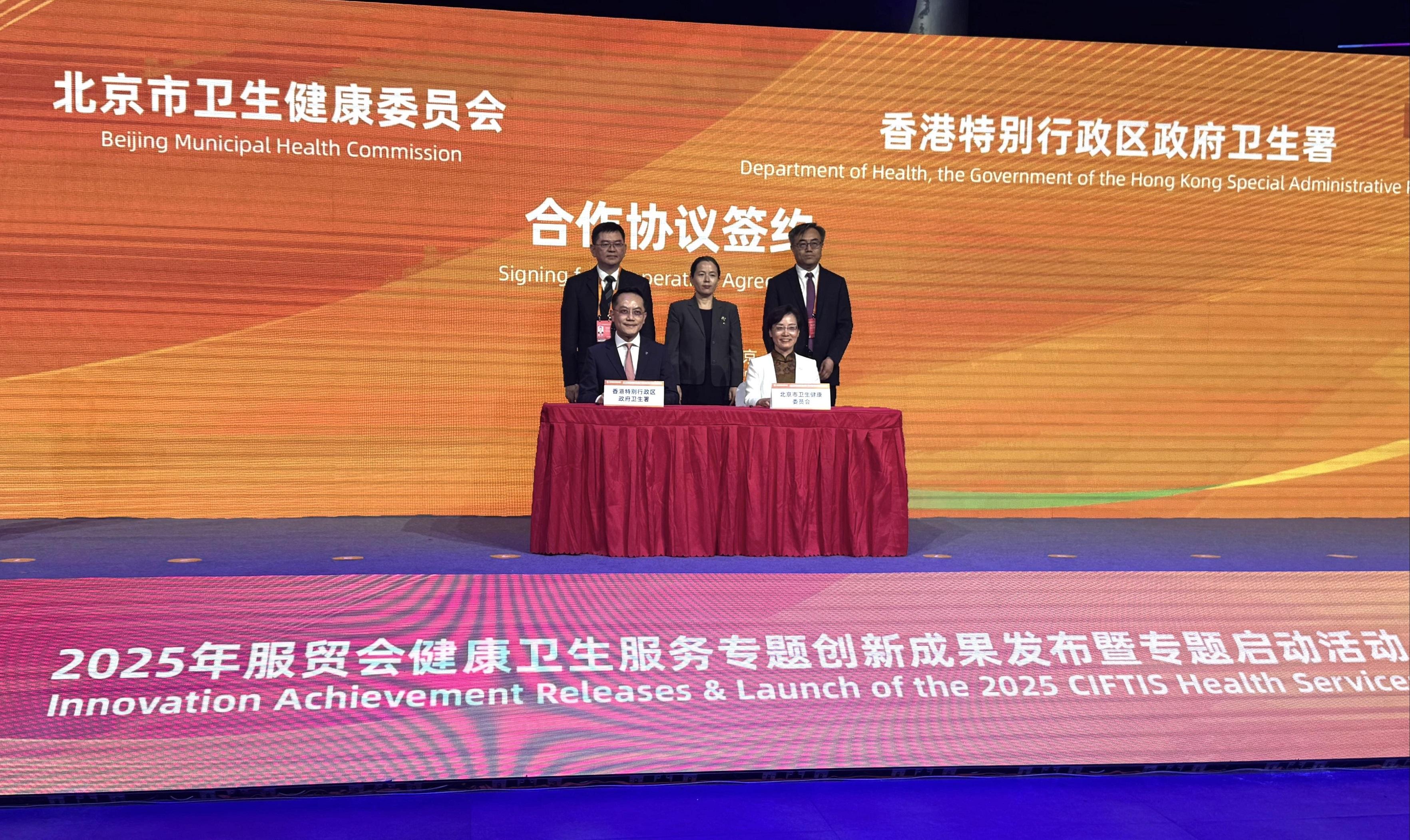 在國家衞健委國際司副司長李娟、北京市人民政府副秘書長許心超及北京市衞健委黨委書記鍾東波見證下,林文健醫生與北京市衞健委主任劉俊彩續簽《北京市衞生健康委員會與香港特別行政區政府衞生署二○二五年至二○三○年度合作協議》。雙方將在公共衞生應急、傳染病及慢病防控、中醫藥傳承發展、衞生人才培養及科技創新等多個重要領域開展更緊密的交流與協作,共同推動衞生健康事業高質量發展。